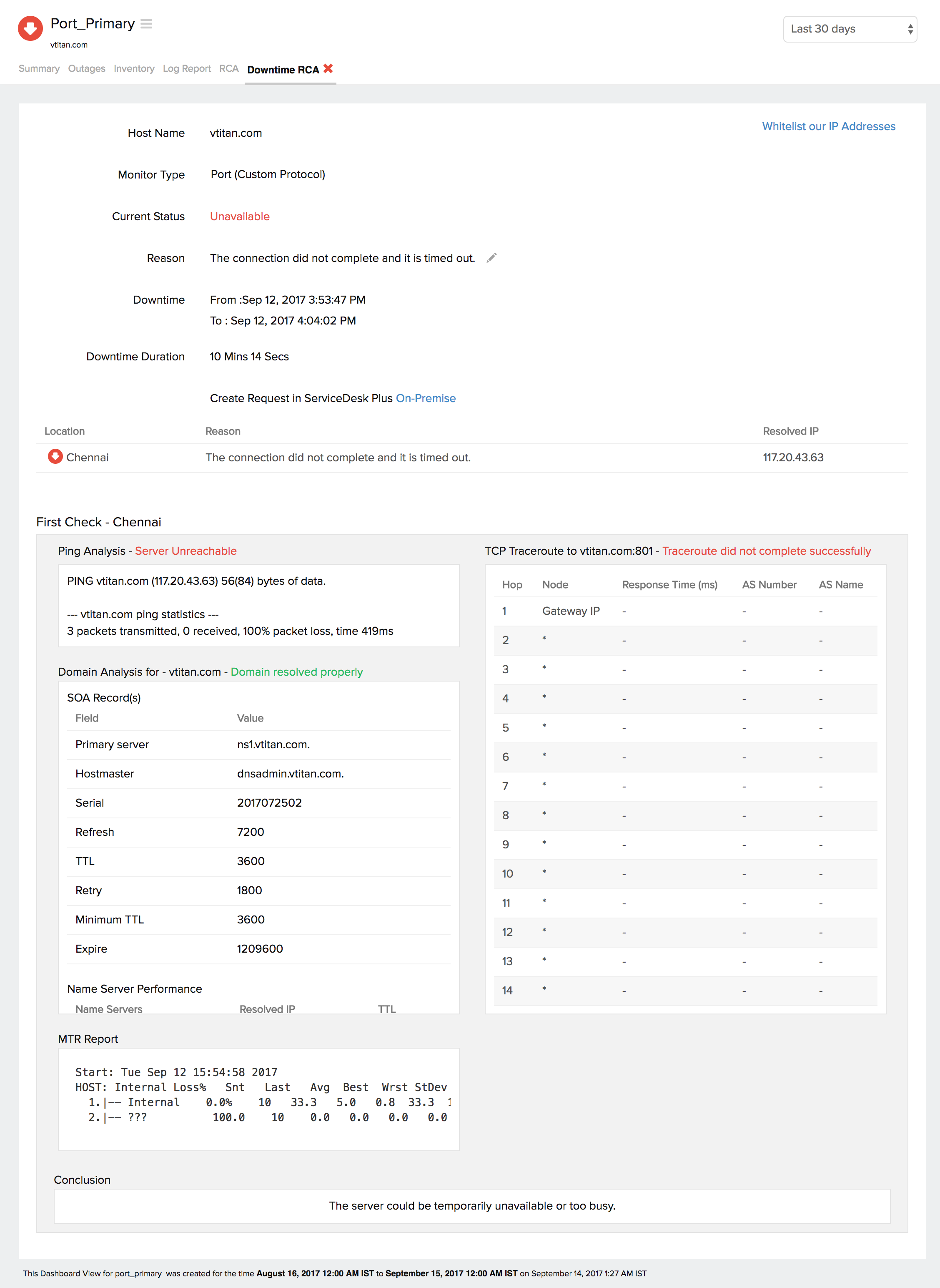 You can retrieve indepth root cause analysis report for your DOWN monitors after 150 seconds of the monitor reporting the outage. RCA Report gives basic details about your monitor, outage details, recheck details and reasons for the outage. Root Cause Analysis automatically generates a plethora of information to arrive at a definite conclusion as to what triggered a downtime. RCA intends to determine the root cause of specific downtime or performance issue. A normal RCA report will comprise of the following details: