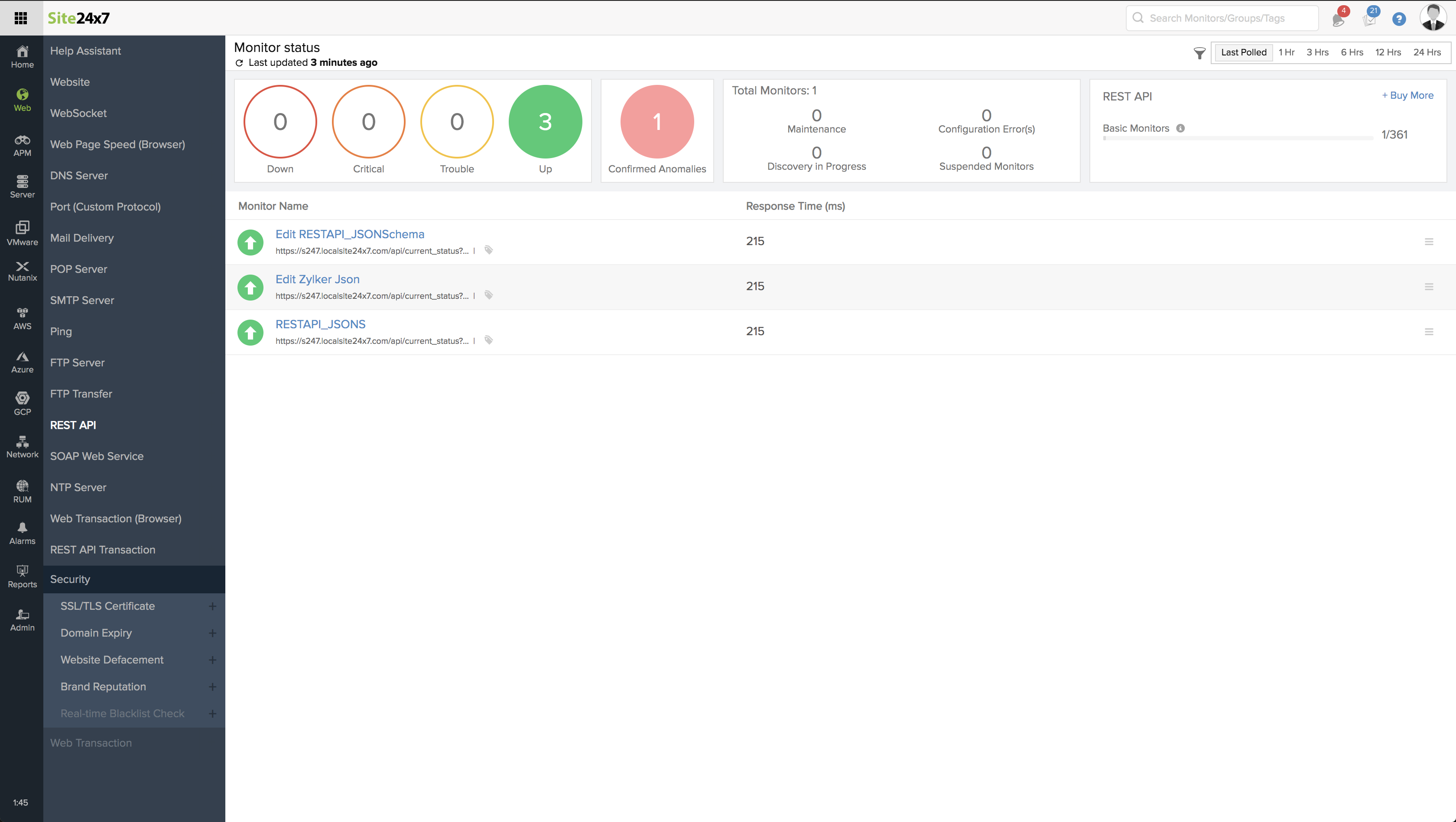 Site24x7's REST API Monitor regularly tracks your API calls and simultaneously determines the response and performance of your REST APIs. Navigate to Web Tab and click the desired REST API monitor to get an insightful analytics on the operation of your REST APIs.