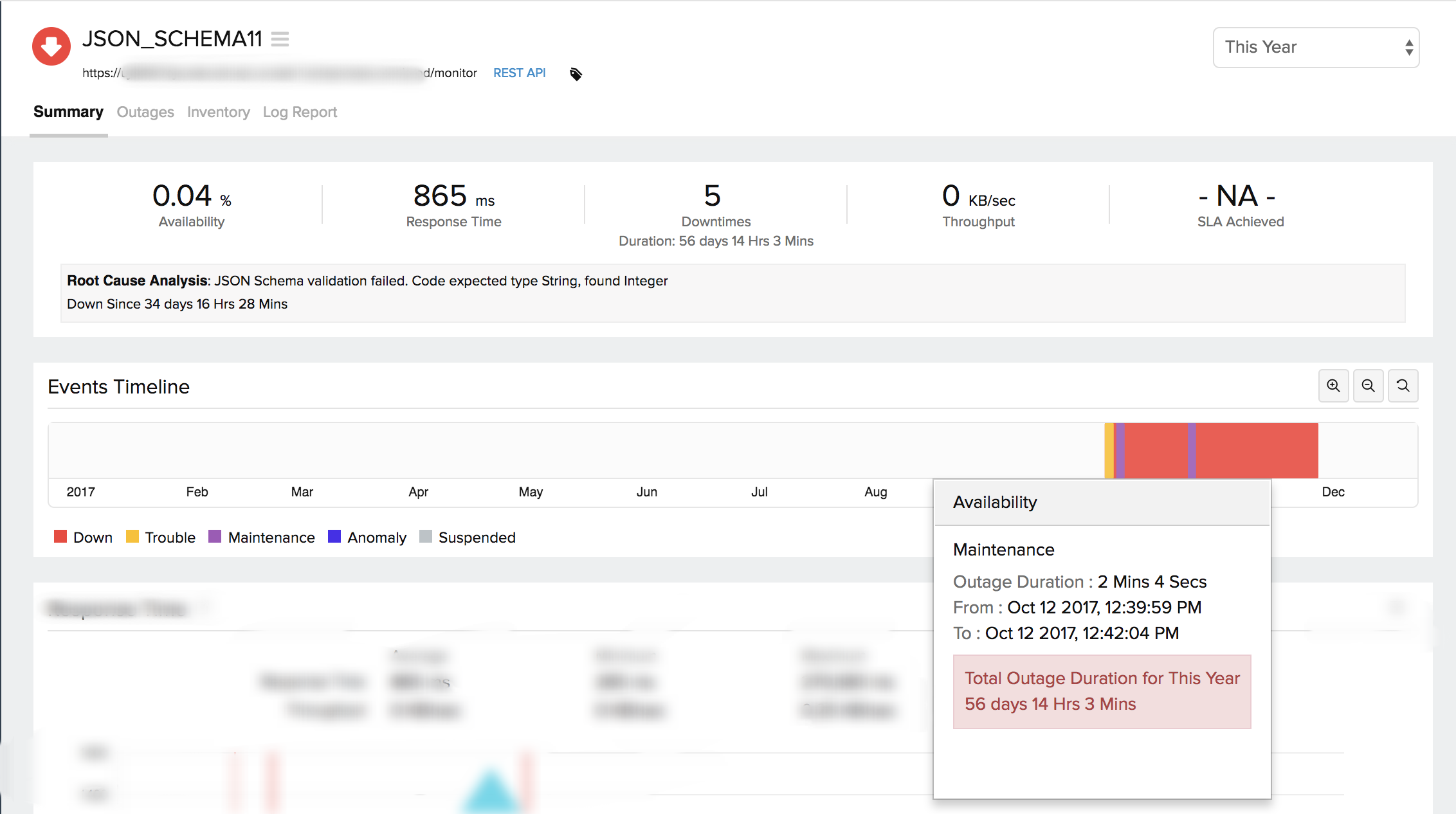 You can access the Outages tab in your monitor's details page to gather detailed insights on the various outage and maintenance downtimes. It provides you with sufficient information to troubleshoot issues. You'll also be able to access the root cause analysis reports for your various outages. On accessing the
