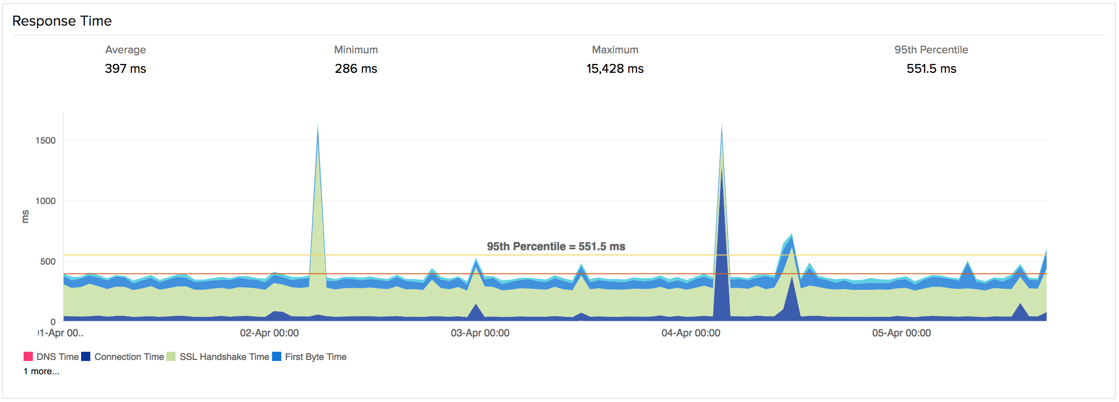 - Response Time: It is the total time taken to fetch a REST API response. The REST API response can be broken down into DNS lookup time, connection time, SSL Handshake Time, First Byte Time and Download time.