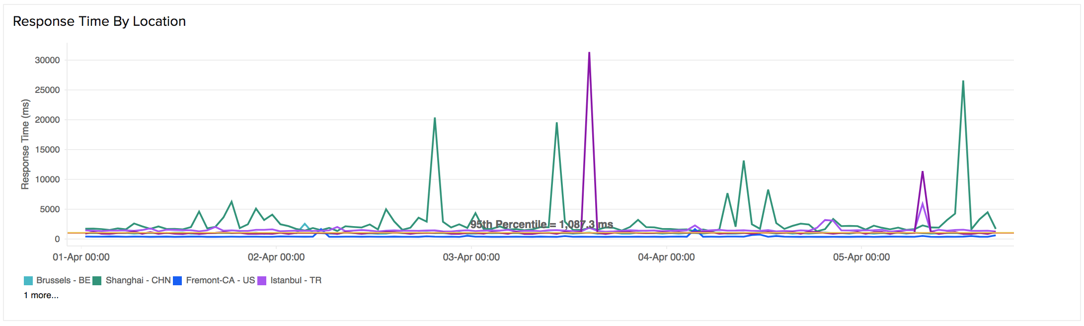 Response Time by Location graph shows the average/95th percentile response time for each day or hour for each monitoring location. This can be employed to check the average/95th percentile response time of your monitors from different monitoring locations. Location legend is provided in the graph for easy administration.