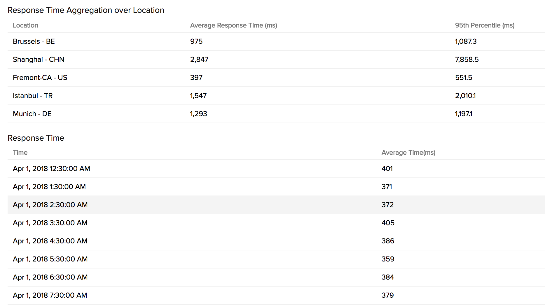 The Availability and Response time for your REST API monitor for each monitoring location is shown in a table format. The total availability percentage, response time (ms) and down duration from each monitoring location can be inferred from this report.