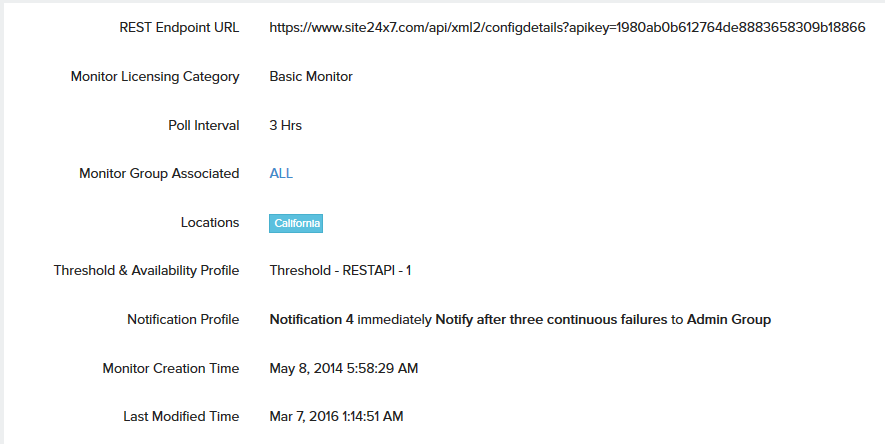 This section captures the basic monitor information and also its various configuration settings including polling locations, poll interval, licensing type, and more.