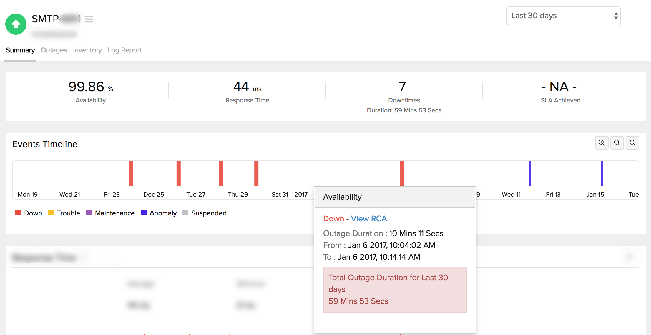 You can access the Outages tab in your monitor's details page to gather detailed insights on the various outage and maintenance downtimes. It provides you with sufficient information to troubleshoot issues. You'll also be able to access the root cause analysis reports for your various outages. On accessing the