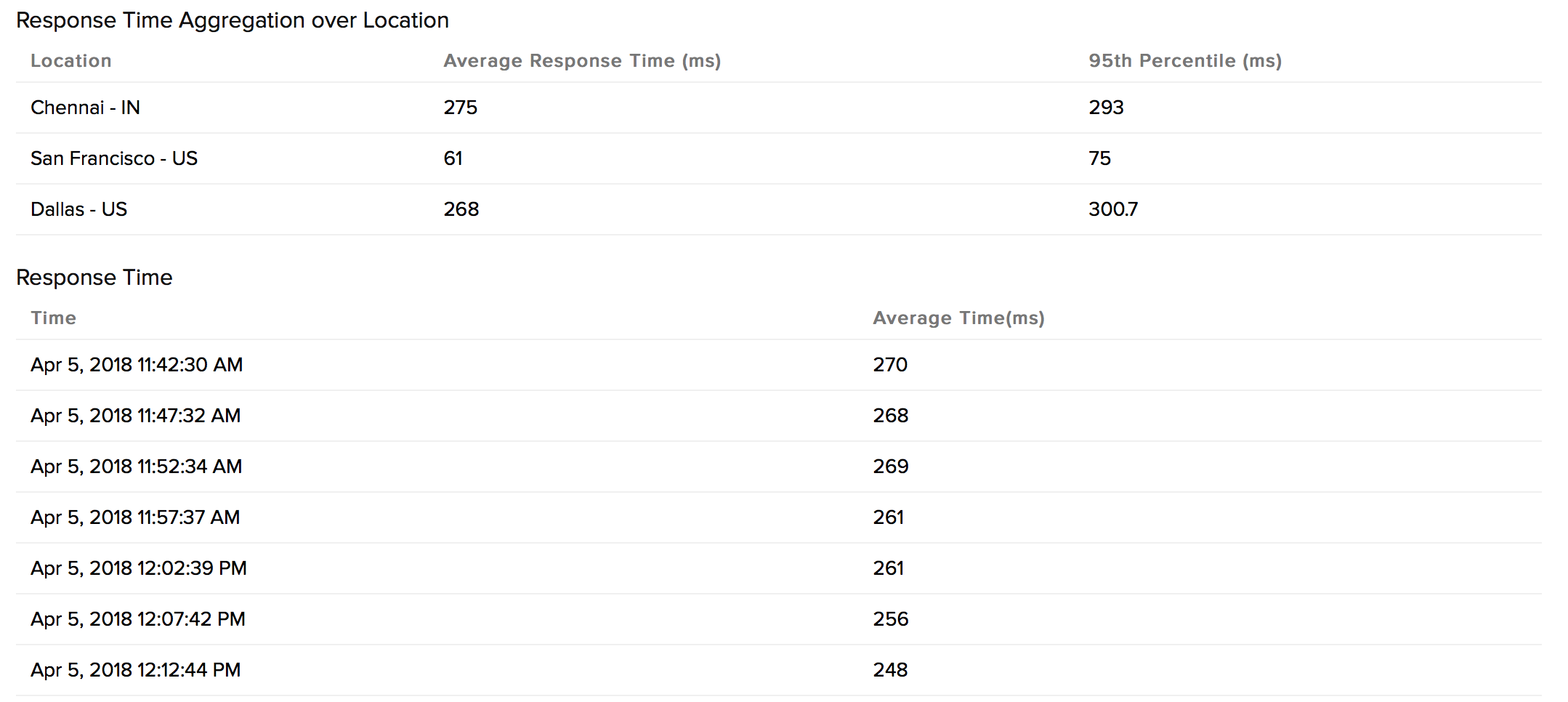 Average Response Time and Average/95th percentile Response Time by Location are detailed in a tabular format.