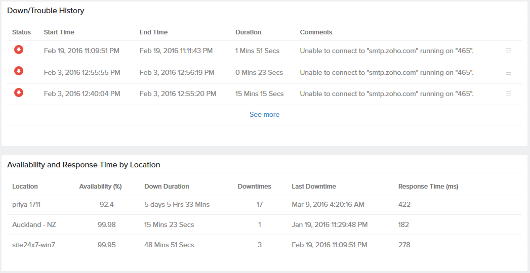 - Availability & Response Time by Location, which renders a graphical and tabular report of location based availability of the SMTP Server and SMTP Server response time in milliseconds.