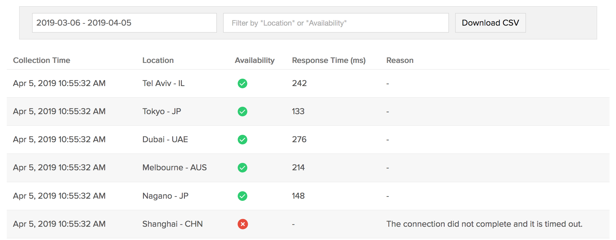 With our integrated log records for individual monitors, you can get an indepth knowledge about the various log details for the configured monitor, over a custom period. You can also filter the log based on location and availability. You have an option to download the log report in CSV format.