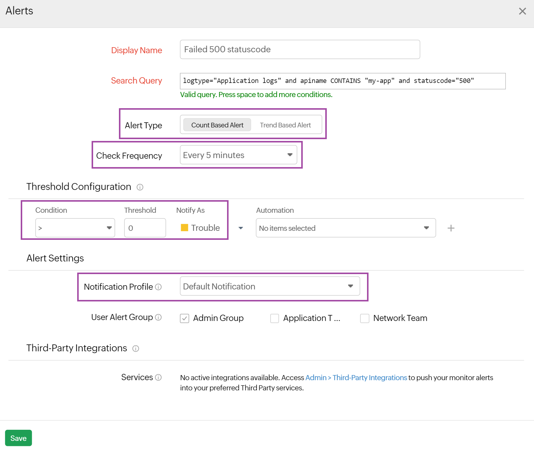 NoteAll the Configuration Profiles settings are applied at the monitor level for the Log Types. Changing any of these settings for one AppLogs Alert in the Log Type will affect all the alerts created under the Log Type.