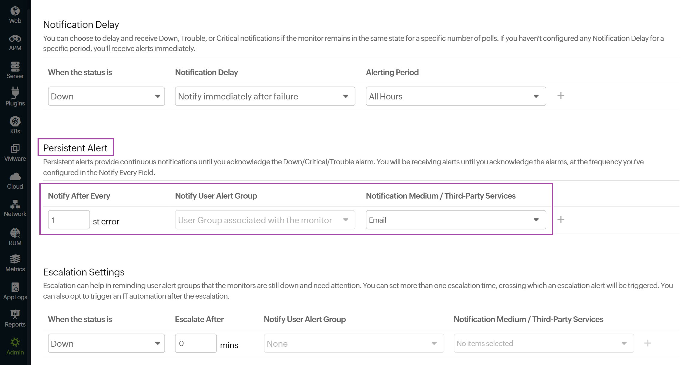 - Notification Profile: The Notification Profile helps with configuring who gets notified and when in case of downtime. Choose a Notification Profile from the drop-down list, use the default profile available, or create a custom Notification Profile.