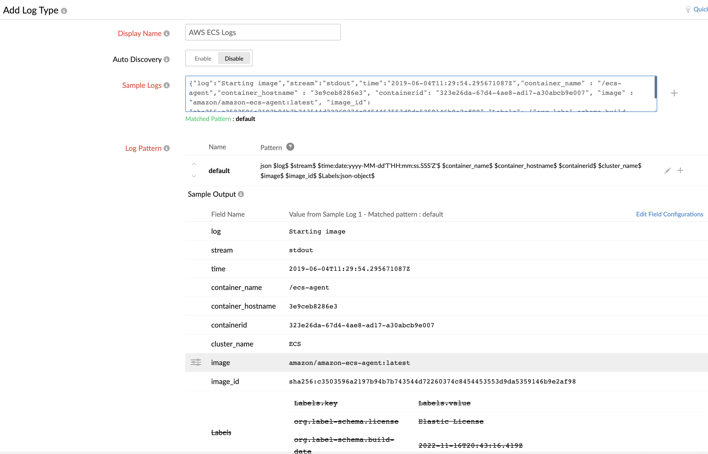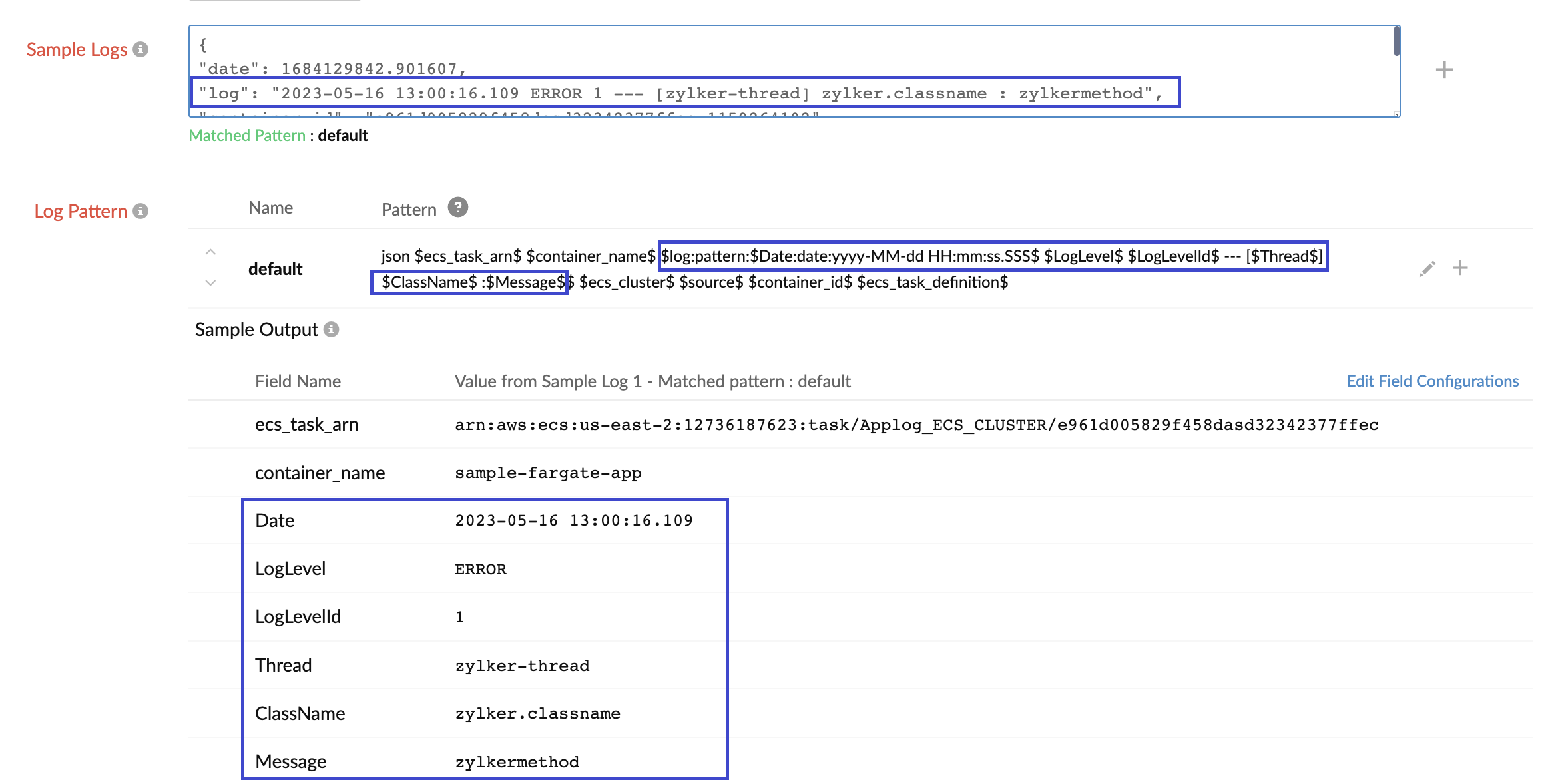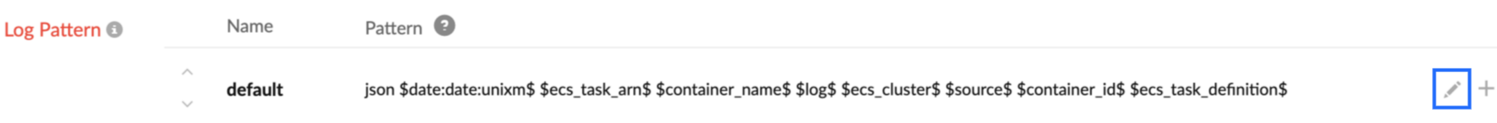 json $ecs_task_arn$ $container_name$ $log:pattern:$Date:date:yyyy-MM-dd HH:mm:ss.SSS$ $LogLevel$ $LogLevelId$ --- [$Thread$] $ClassName$ :$Message$$ $ecs_cluster$ $source$ $container_id$ $ecs_task_definition$
