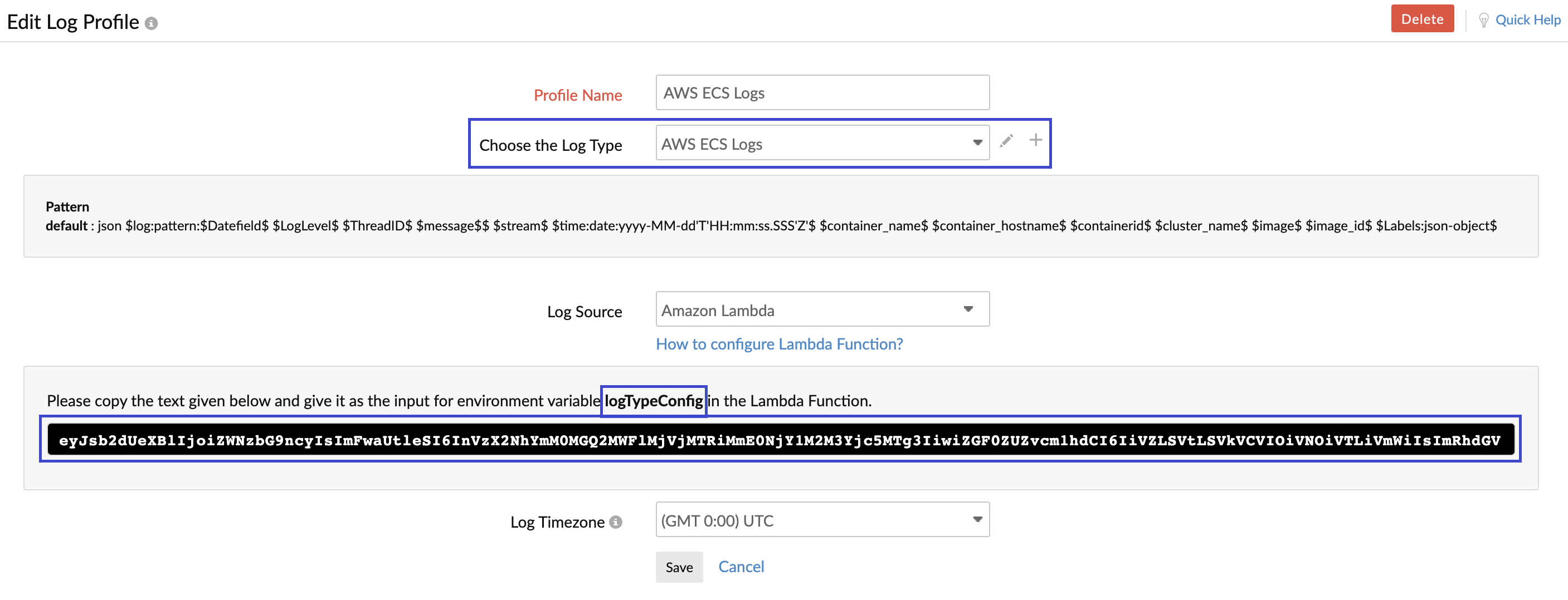 - Select AWS ECS Logs from the Log Type drop-down.
