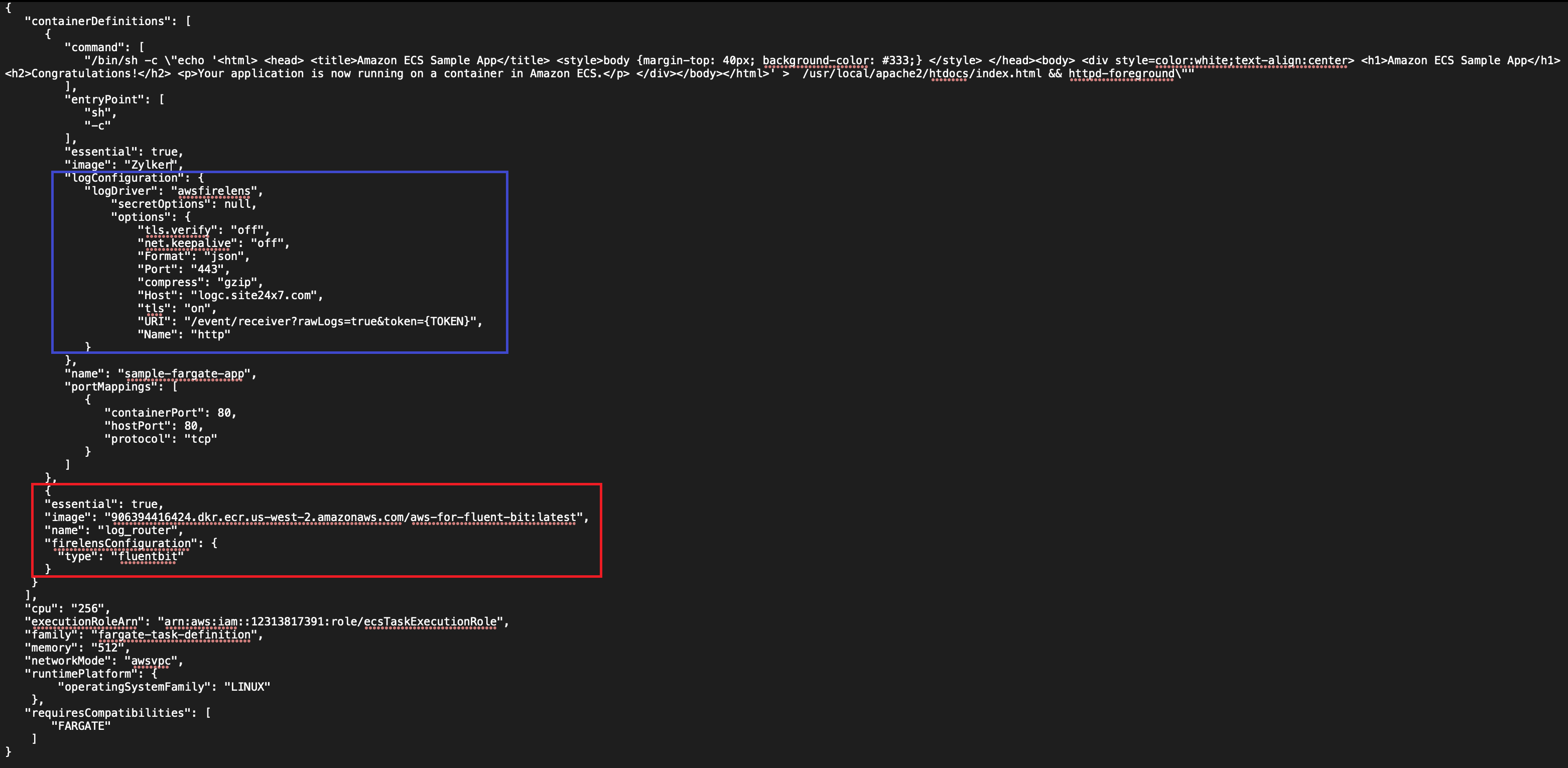 In the same Fargate task, define a log configuration for the desired containers to ship logs. awsfirelens should be the log driver for this configuration, with data being output to Fluent Bit. - Here is an example snippet of a task definition where FireLens is the log driver and outputs data to Fluent Bit.