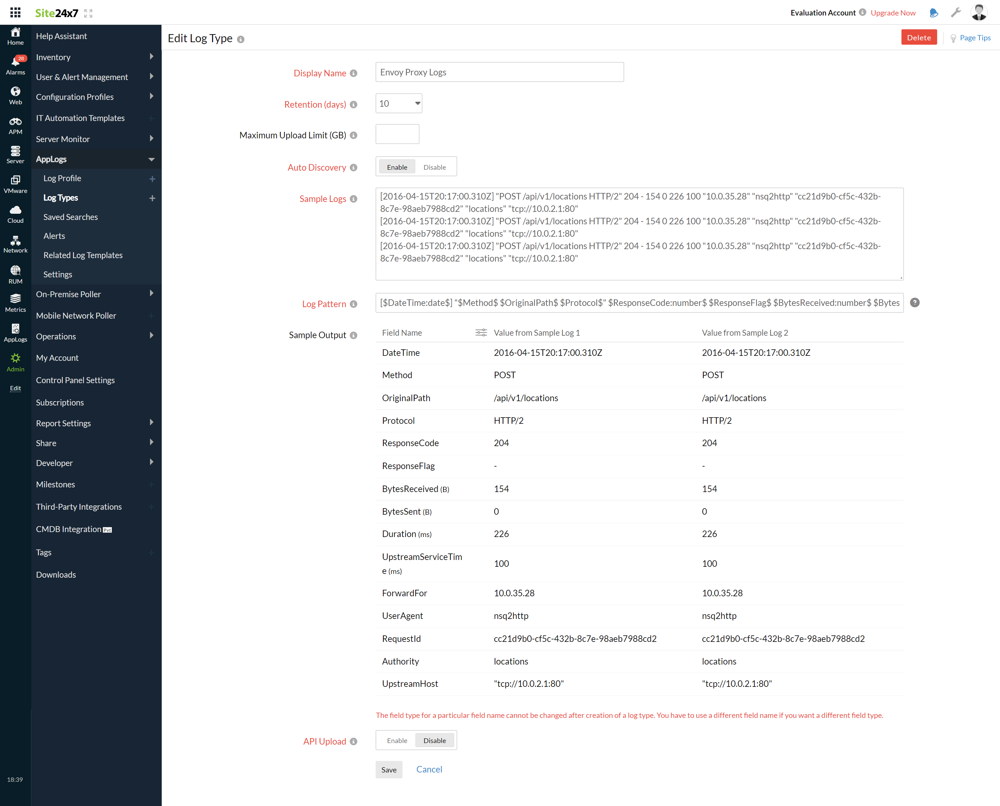 These logs are separated into fields, each of which takes its respective value and is then uploaded to Site24x7.