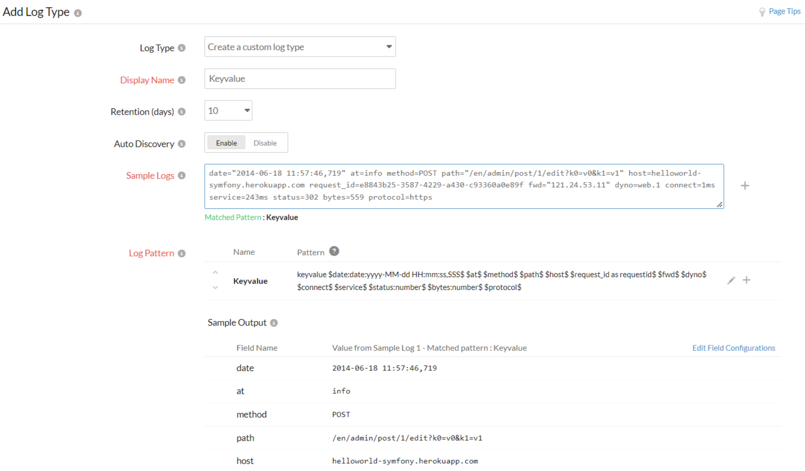 DateTime and heroku are the field names in a normal log pattern, whereas the field names followed by the Message:keyvalue keyword follow the key-value log pattern.