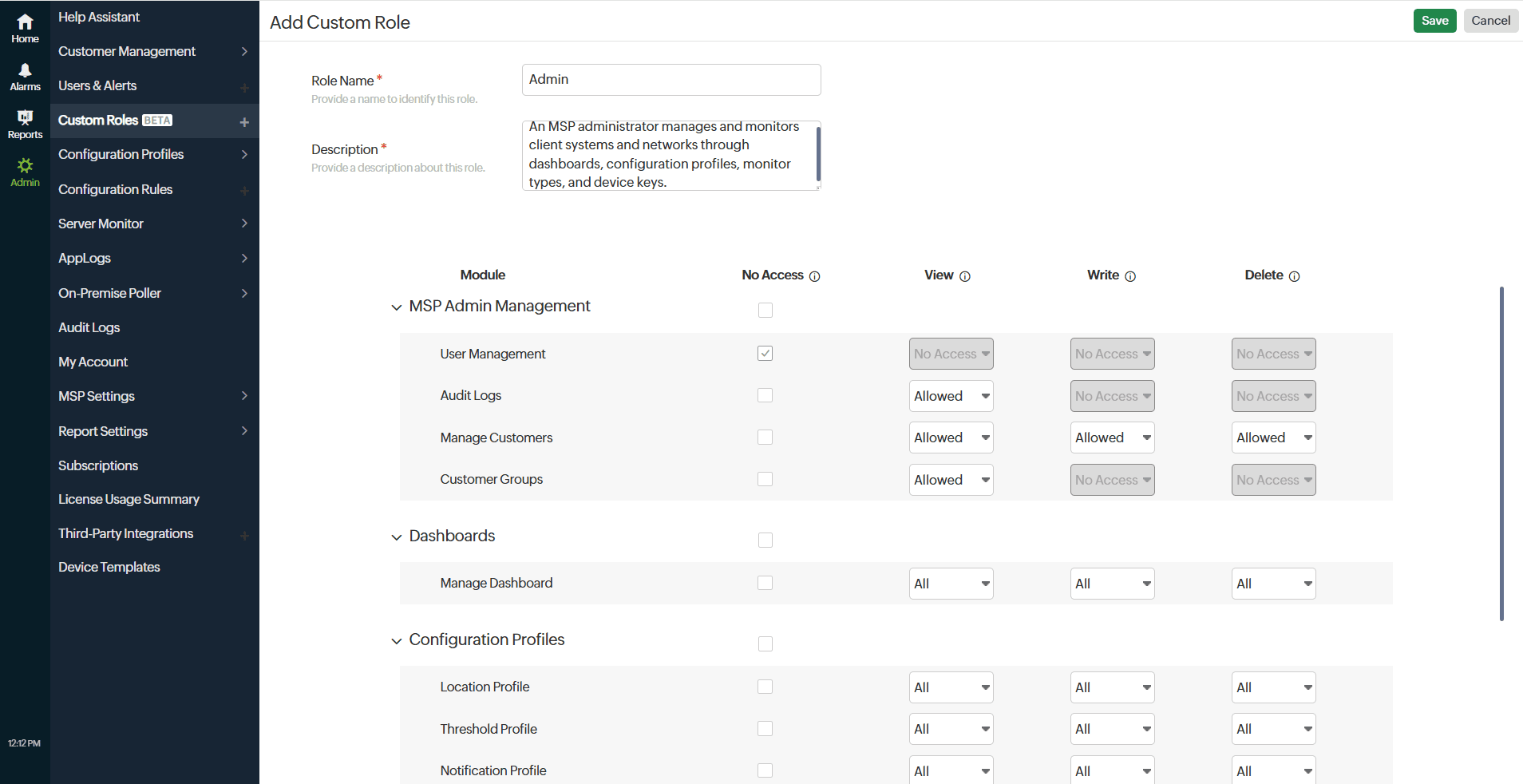 • While assigning roles for MSP Admin Management, you can grant Allowed access to View and Write to allow the user to add user account and update account information. You can grant No Access to Delete to prevent them from terminating the account information.