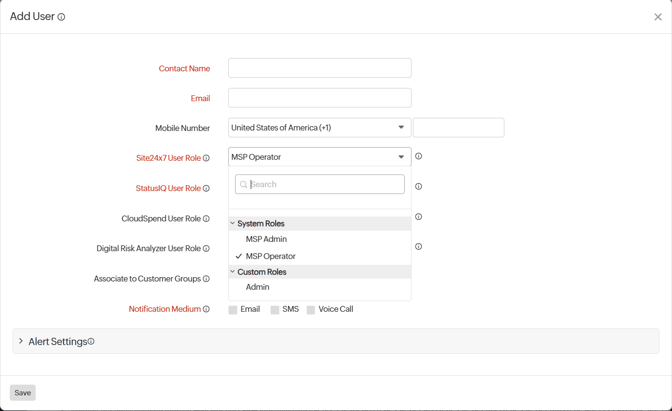 When a new user is configured, a role is assigned to them. Select user roles from the Site24x7 User Role drop-down field, which includes System Roles or Custom Roles. System Roles comprise of traditional roles such as: