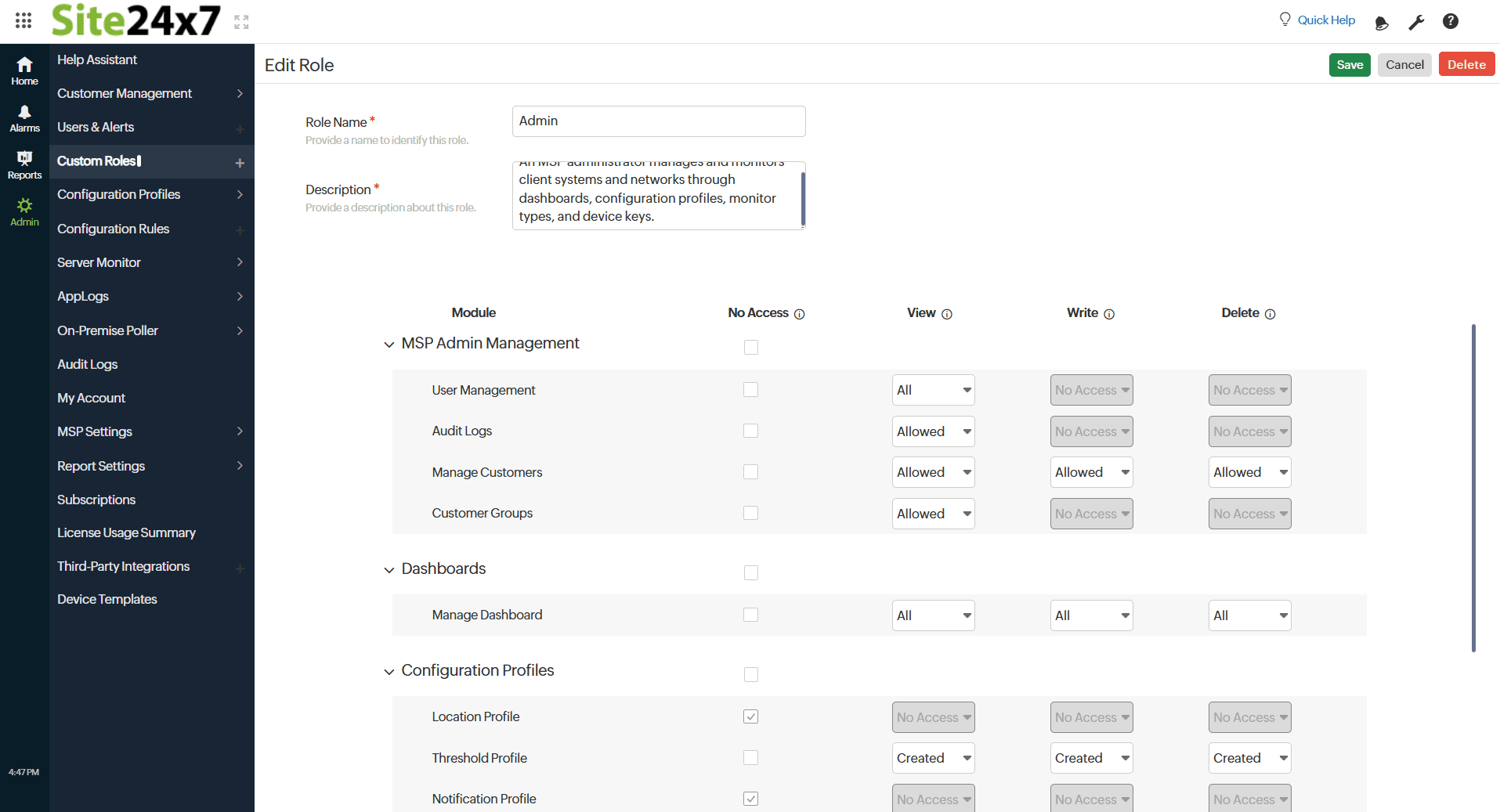 2. On the Edit Role page, the MSP Admin Management, Dashboards, Configuration Profiles, MSP Monitor Types, and Device Key access permissions can be customized.