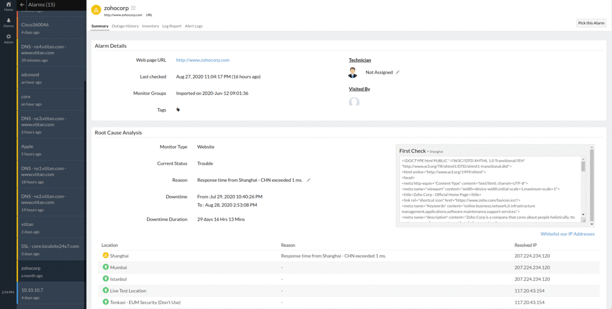 It offers detailed insight into the outage history of your monitor. You can view the real-time status, the exact downtime period and duration, and specific reason for the down status. You can also view detailed downtime RCA details. You can access the