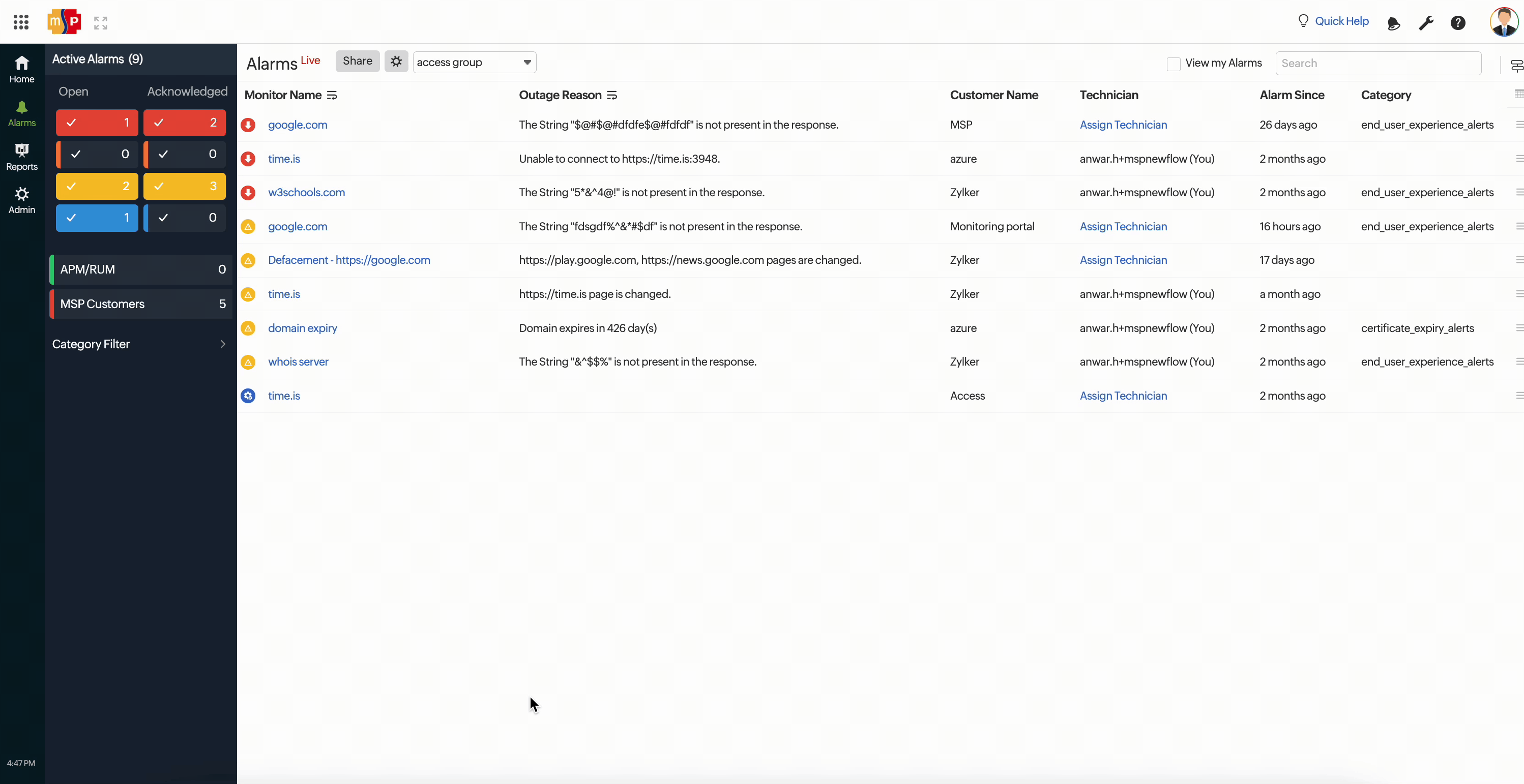 Site24x7's MSP control panel has an inbuilt Alarms View controller to manage all monitor alarms across your customers' accounts. It lets you keep a tab on all the monitor issues across your customers' accounts by grouping all alerts by monitor name and severity. However, an MSP will only be able to see monitor alarms from those customer account to which he is associated with. The Alarms list showcases all monitors that are currently in a Down/Trouble/Configuration Error status. Monitors that are in any other status are not listed here. Incase the issue is resolved automatically or the monitor is deleted from your list–the monitor status will render itself as UP inside the monitor details page,until the next poll and the alarm will be removed from the Alarms list. Individual alarms listed in the alarms dashboard will have links to their corresponding alarm specific details page, where information is grouped into Alarm Summary, Outage history, Inventory, log report, and Alert logs for the monitor. The alarm classification based on the severity levels help you to pin-point alarms that need to be given the highest priority and should be addressed first. Additionally, you can assign alarms to any technician according to your need. A manual filter enables you to extract the down and trouble alerts for a specific monitor category. In addition to all these, the alarms can also be filtered based on the alarm acknowledgement status by technicians.