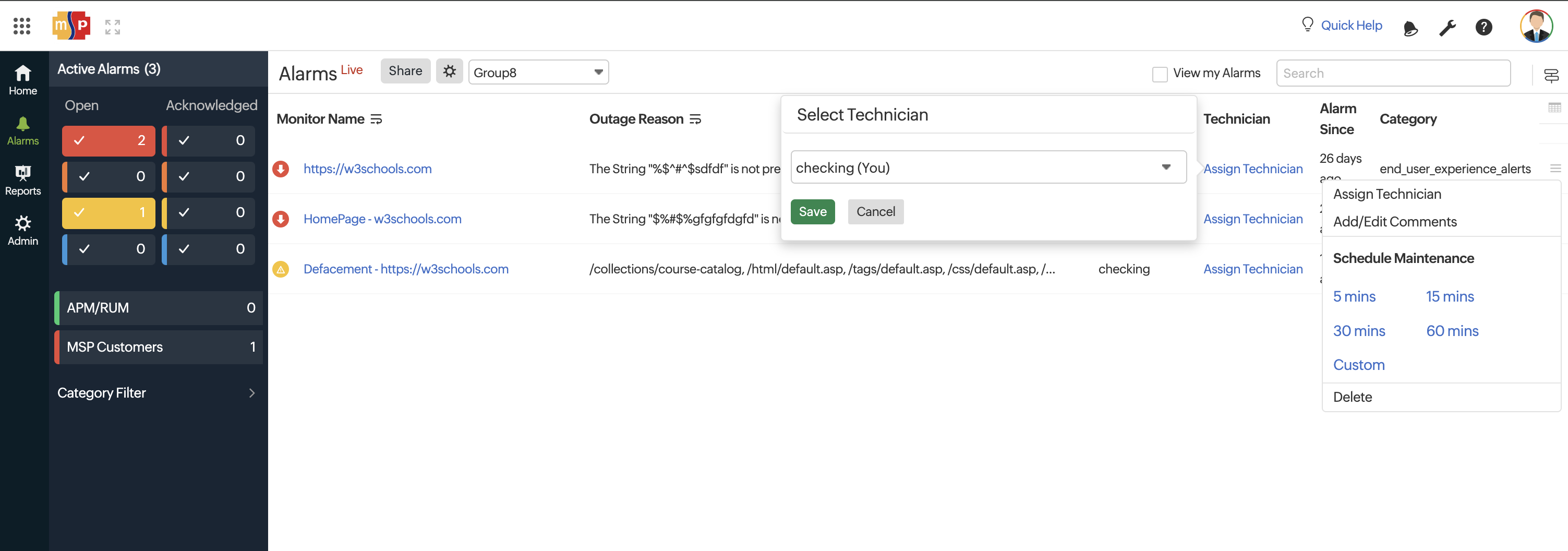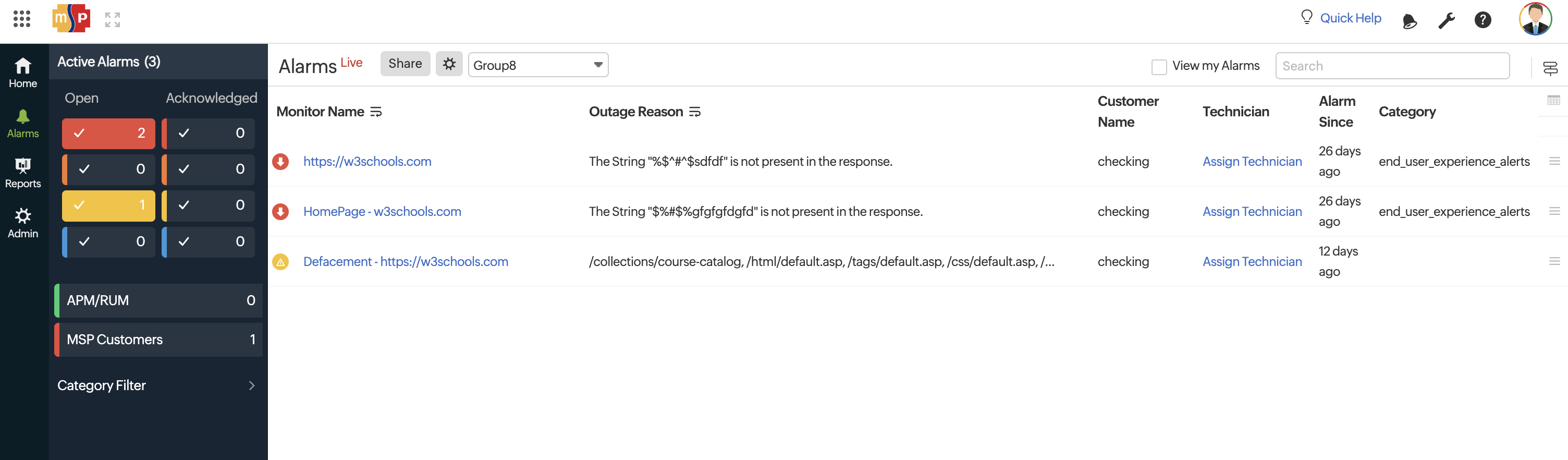 NoteAn MSP can manage alarms of monitors with statuses (Down, Critical, Trouble, and Configuration Errors) only for the customer accounts with which they are associated based on their customer group.