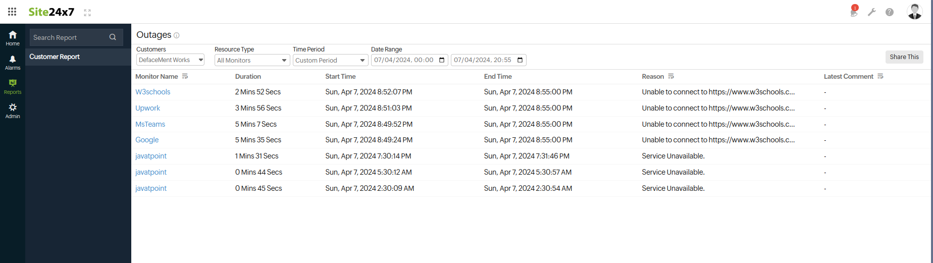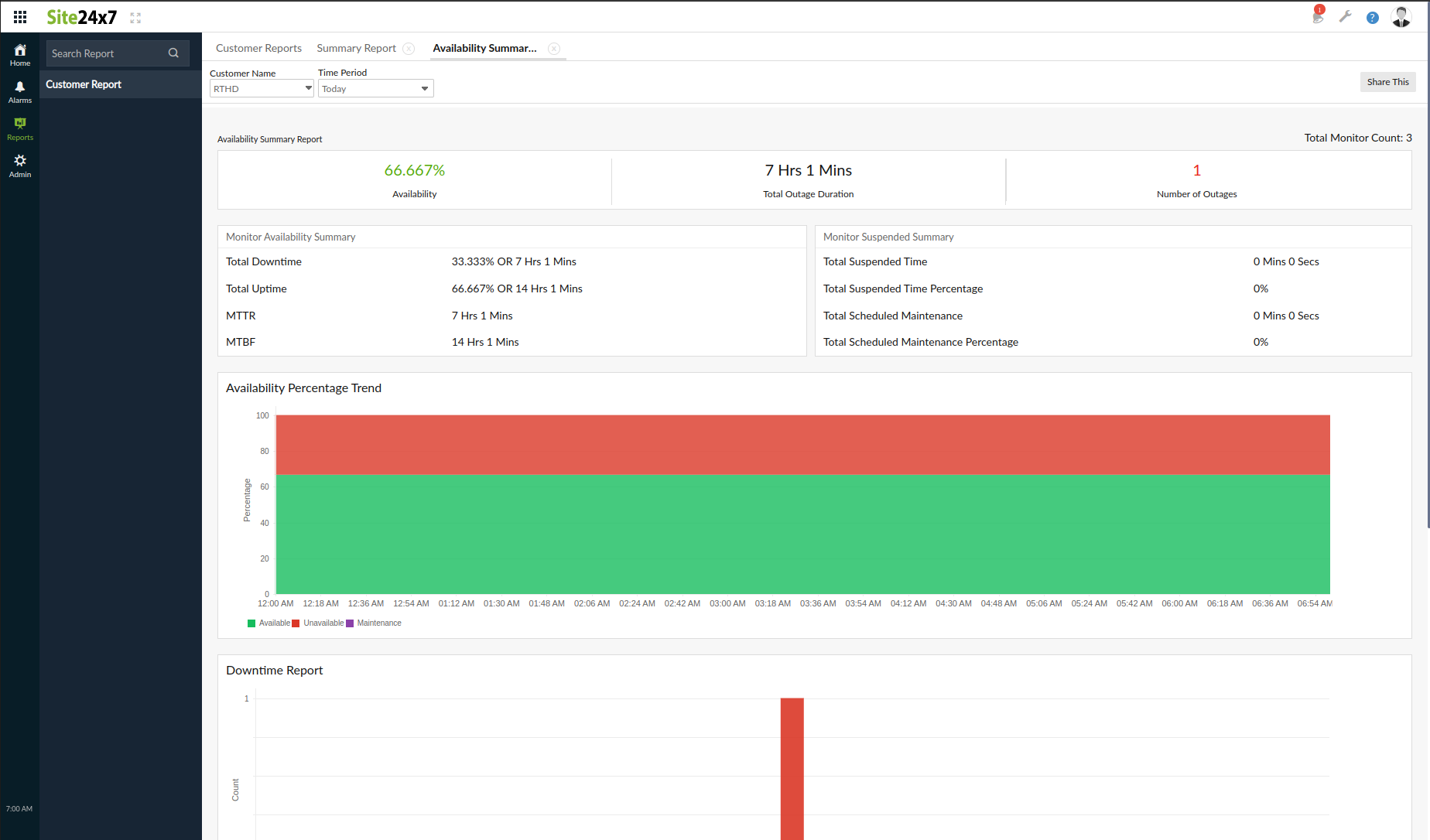 The outages report helps you view all the outages related to your resources over a specific period of time on a single dashboard. Outages are captured and made visible right on the home screen to keep you updated about any critical issues. Now, you can view reports on outages for the customers in your account in one place.