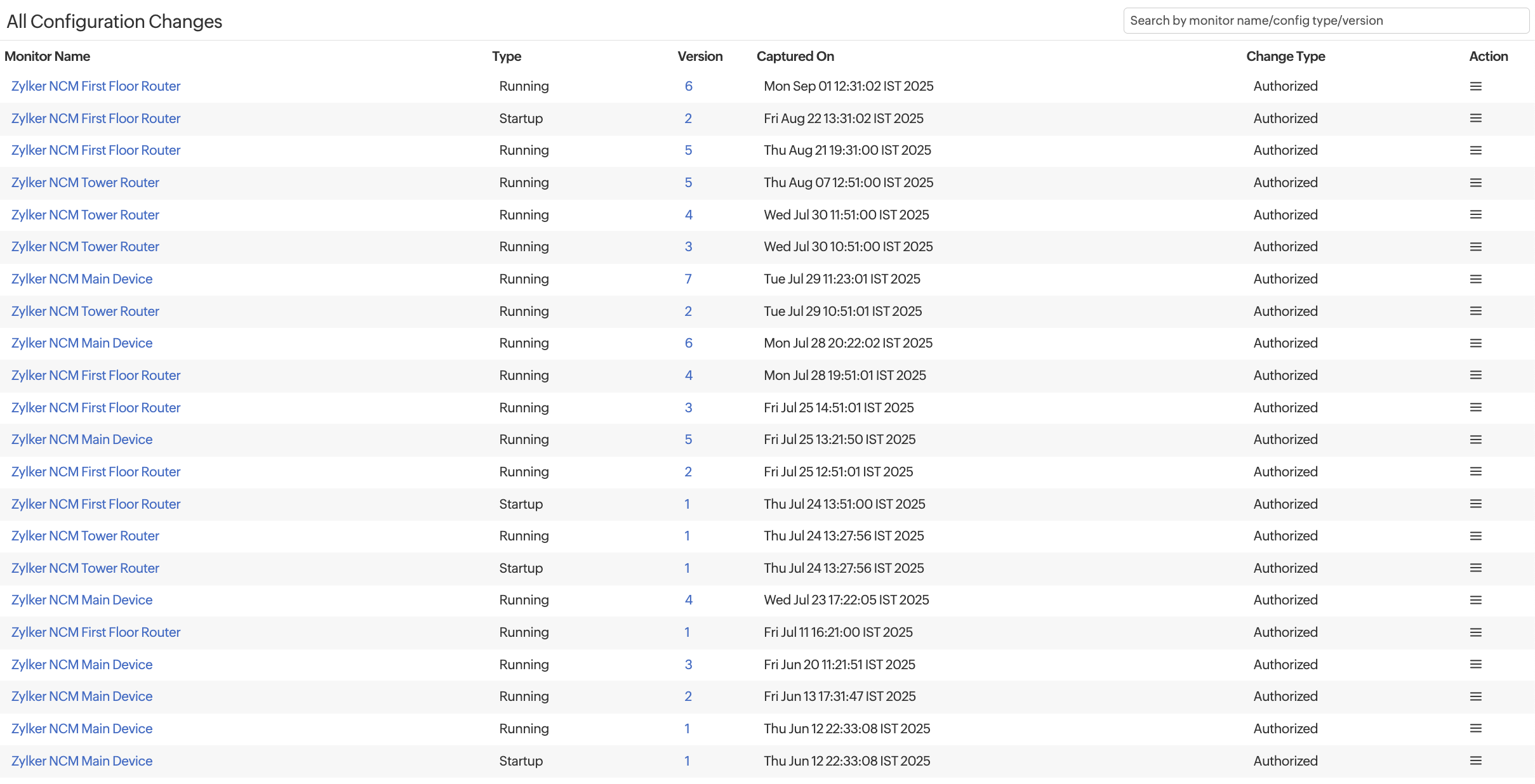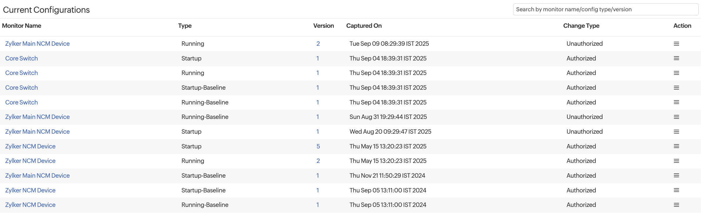 The Actioncolumn lets you perform various actions on each device configuration, including Set as Baseline, Mark as Authorized/Mark as Unauthorized, Edit Description, Compare with Baseline, Compare with Startup/Compare with RunningCompare with Previous, Compare with Any, or Upload Configuration. Click the hamburger Hamburger Icon icon in the Action column to view these options. This way, you can track your device configurations and take necessary actions if any discrepancy is found.