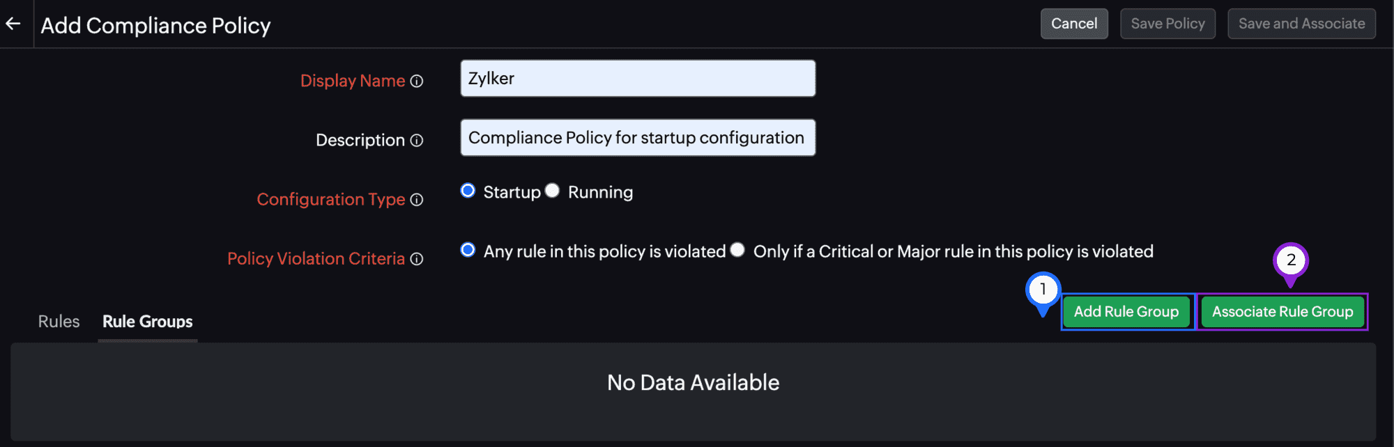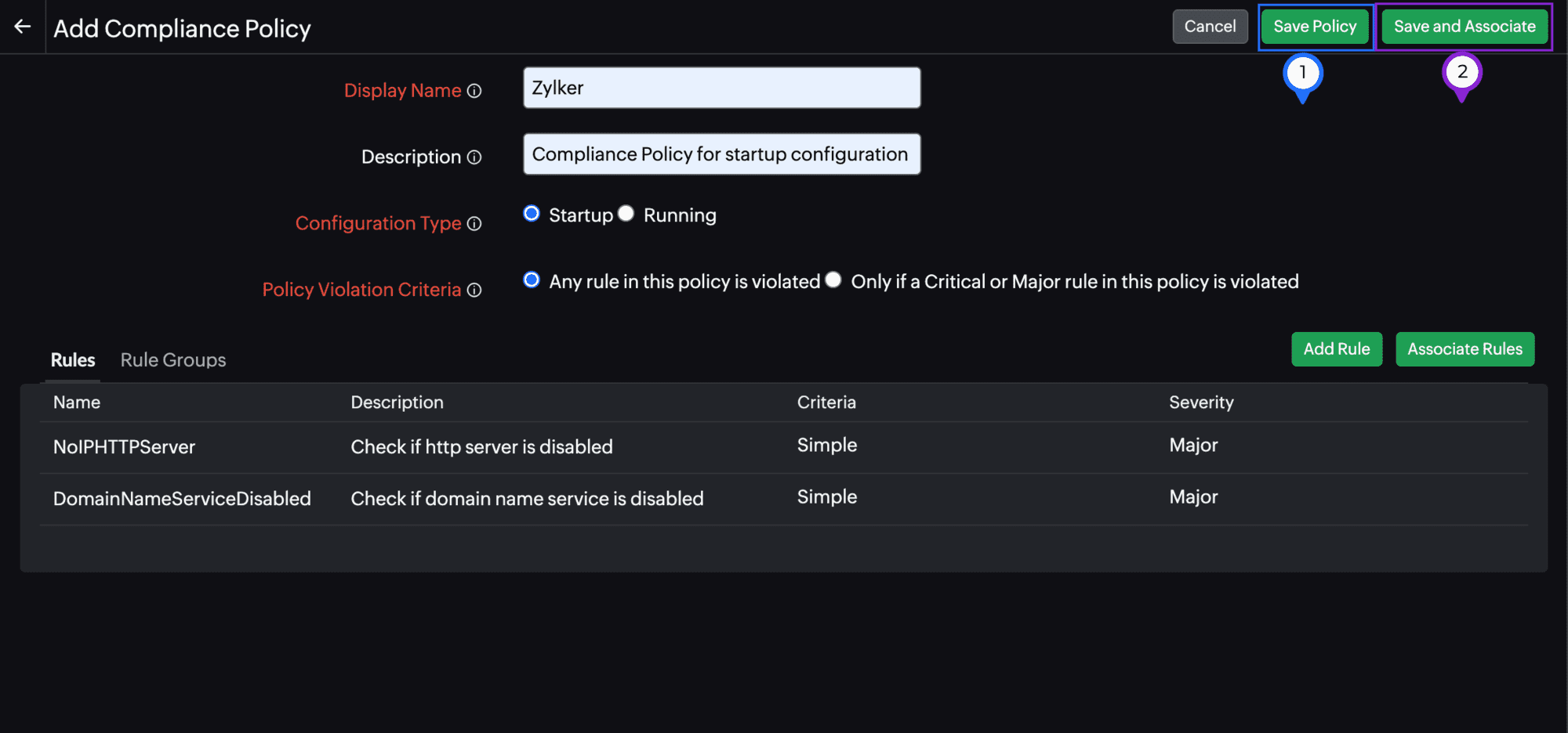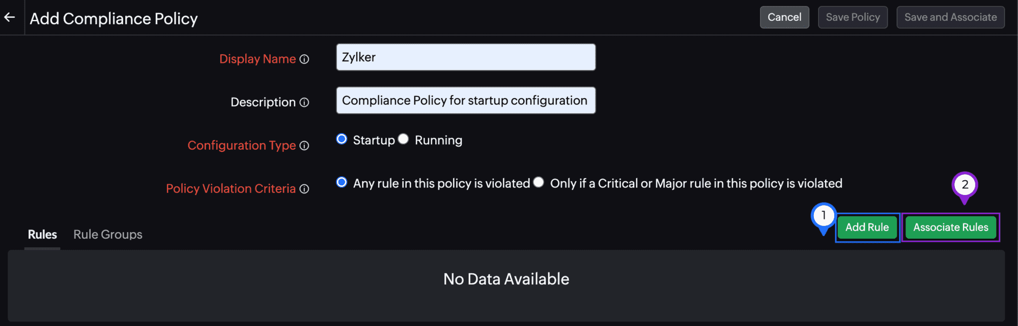 Figure 14. Add Compliance Policy page. - You can also associate an existing rule by clicking Associate Rules (Figure 14, marked as 2). Once you do that, the Associate Rules pop-up window will open where you can select the rules to be added to a Default Rule Group. Then, click Save (Figure 15).