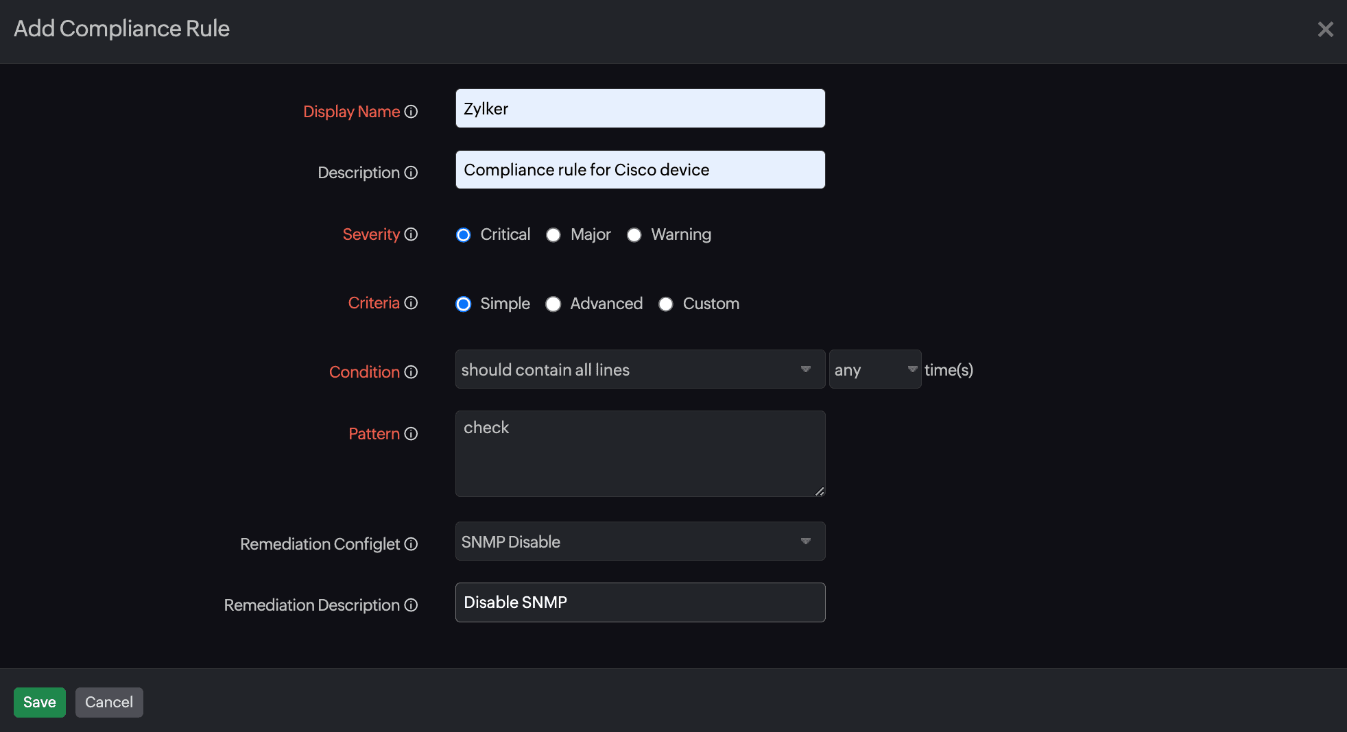 Figure 4. Adding a compliance rule with Custom Criteria.According to the given example in Figure 4, if a configuration file has a block that starts with check and ends with end, and includes the element date, it will be examined for the patterns utc (occurring any number of times) and GMT-4 (occurring once). If these conditions are present, a Critical alert will be produced for the rule.