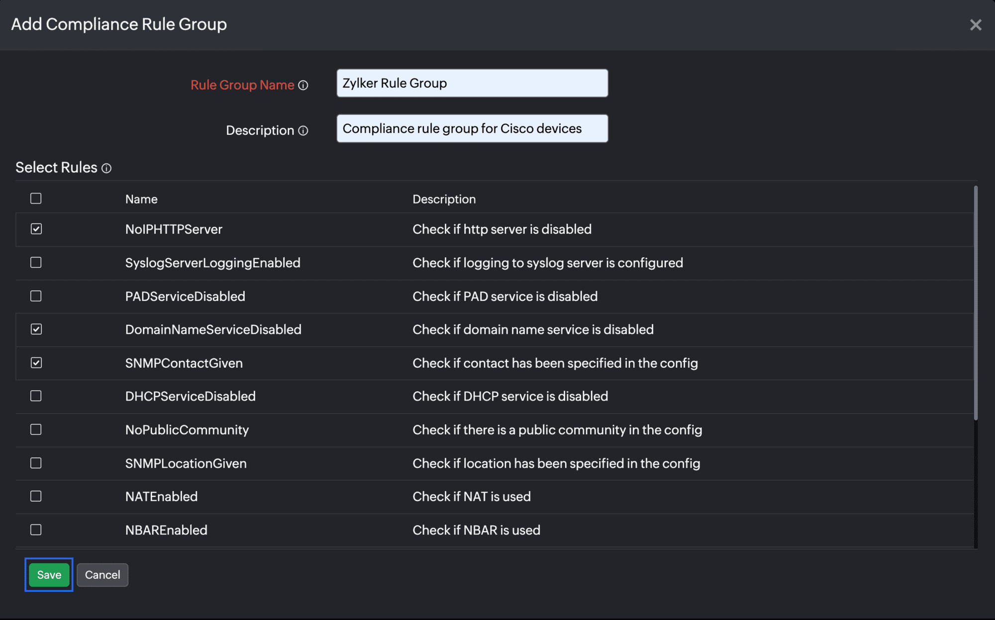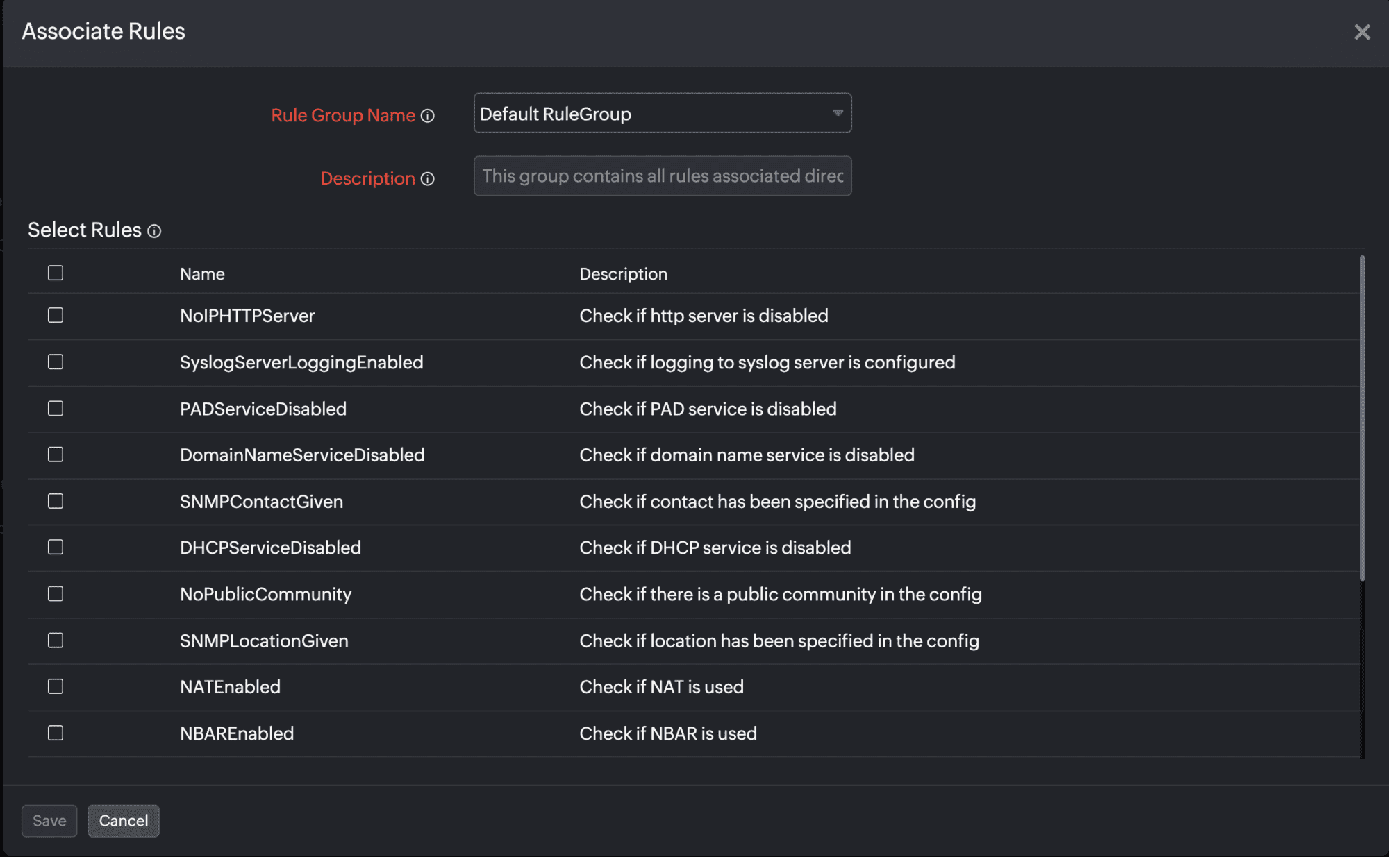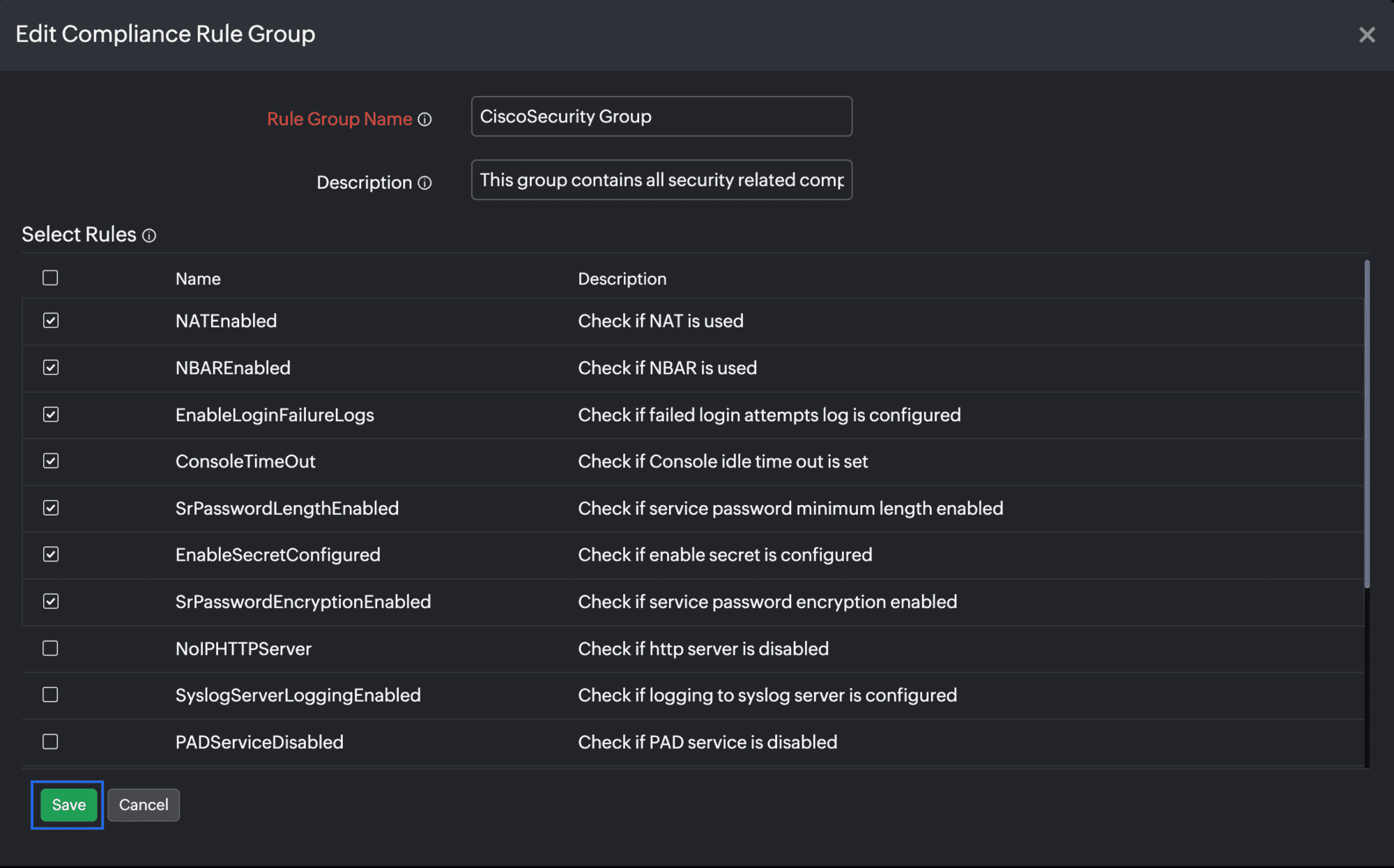 - Next, in the Select Rules section, select all the rules that should be added to the rule group. Then, click Save (Figure 9).
