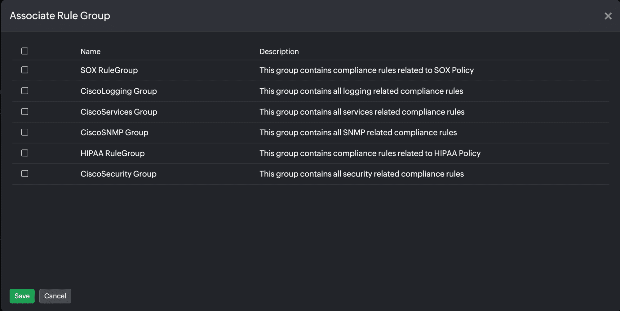 Figure 12. Edit Compliance Rule Group pop-up. - Once you have completed all the changes, click Save.
