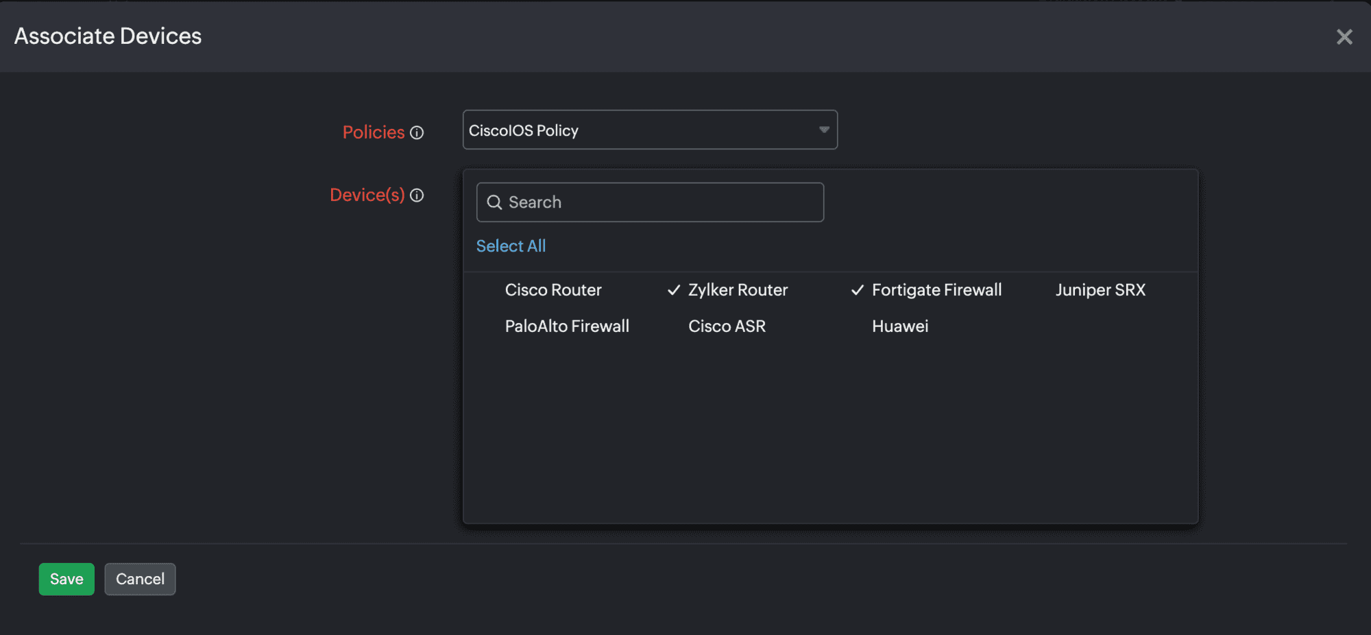 - Next, in the Device(s) field, select all the devices which you wish to associate to the policies selected in the previous step. Then, click Save.