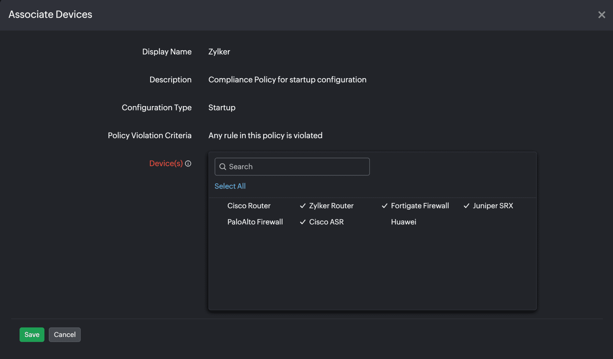 Figure 20. Associating devices to a compliance policy. - In the Associate Devices pop-up (Figure 19), select the devices to which you wish to associate this policy, and then click Save.