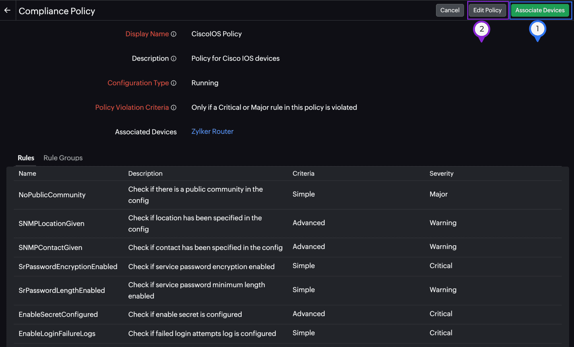 Figure 18. Saving and associating a new compliance policy. - Click Save and Associate to associate the policy to an NCM device (Figure 18, marked as 2). In the Associate Devices pop-up (Figure 19), select the devices to which you wish to associate this policy, and then click Save.