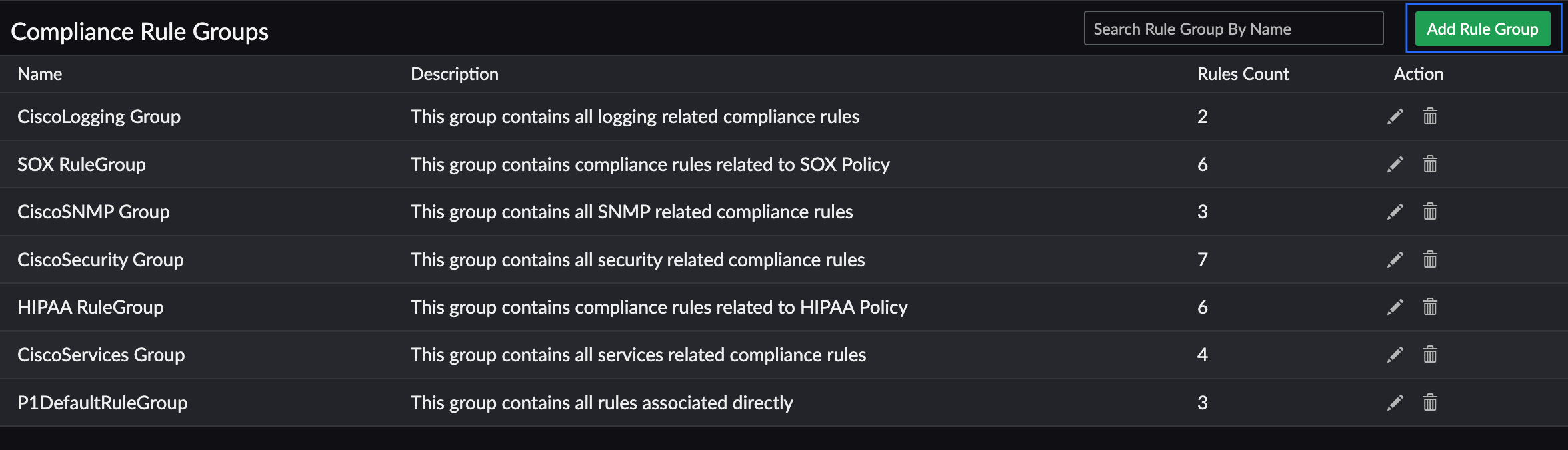 - Click the Add Rule Group button in the top-right section of the Compliance Rule Groups screen.