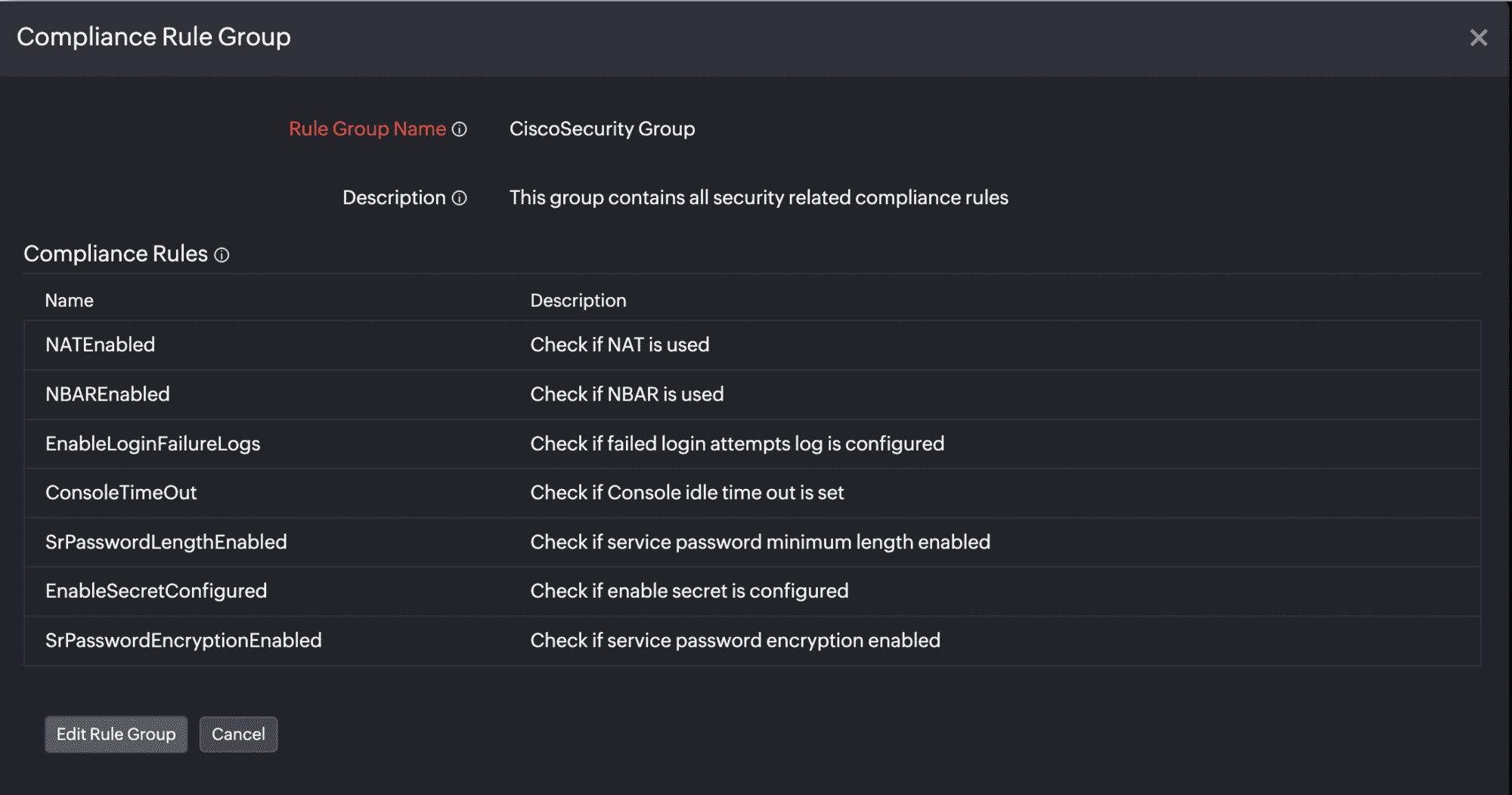 Figure 10. Editing a compliance rule group. - You can also click anywhere on the row to view more details about the compliance rule group, and then click Edit Rule Group at the bottom-left of the pop-up.