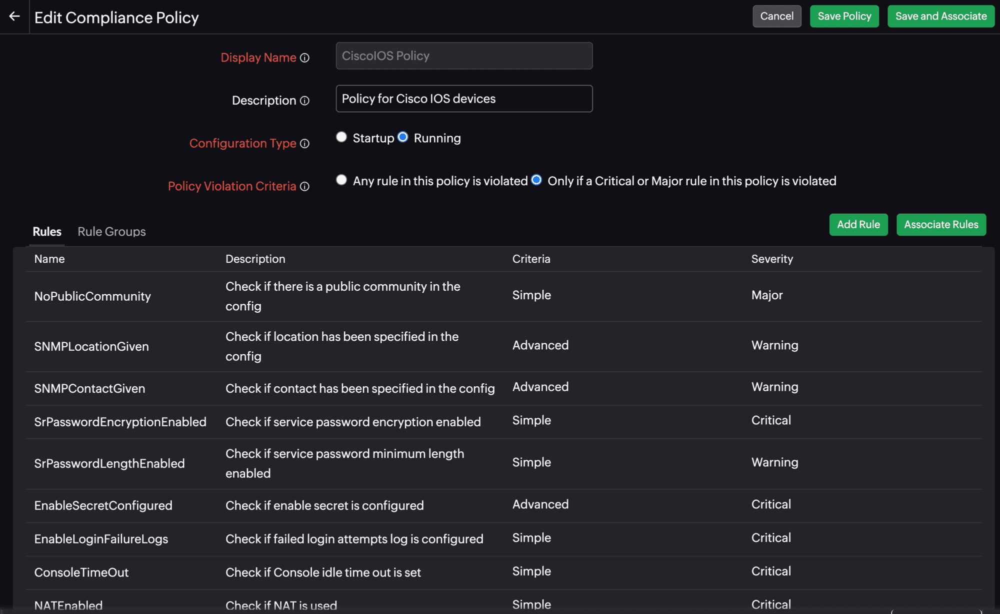 - Policy in the Policies view. Learn more about the compliance policies available by default in our NCM tool and the rules associated with them.
