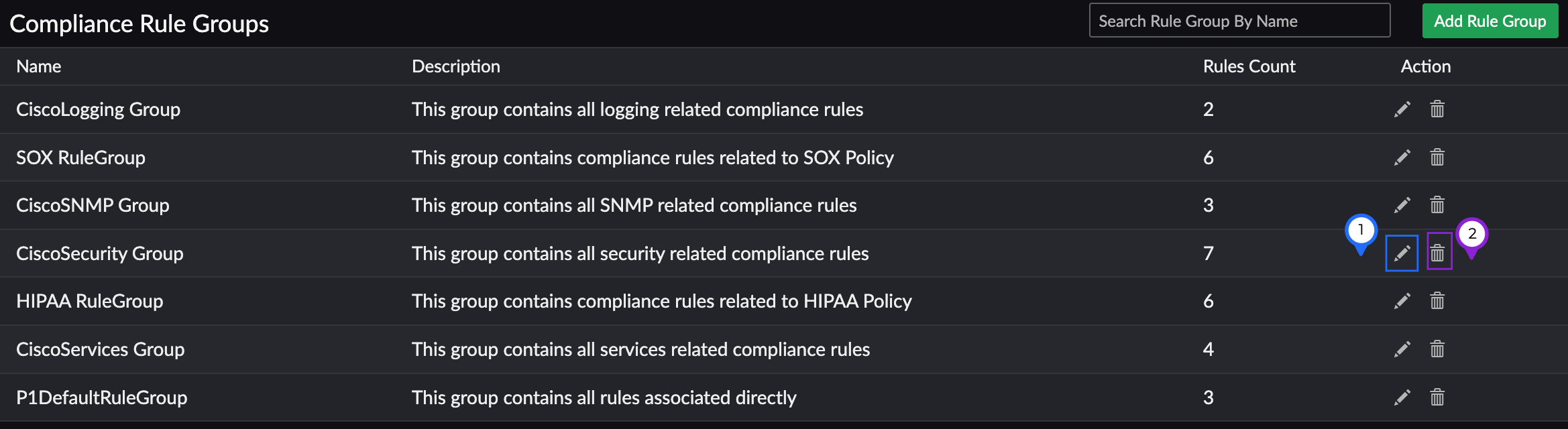 icon beside a rule group (Figure 10, marked as 2) on the Compliance Rule Groups screen.