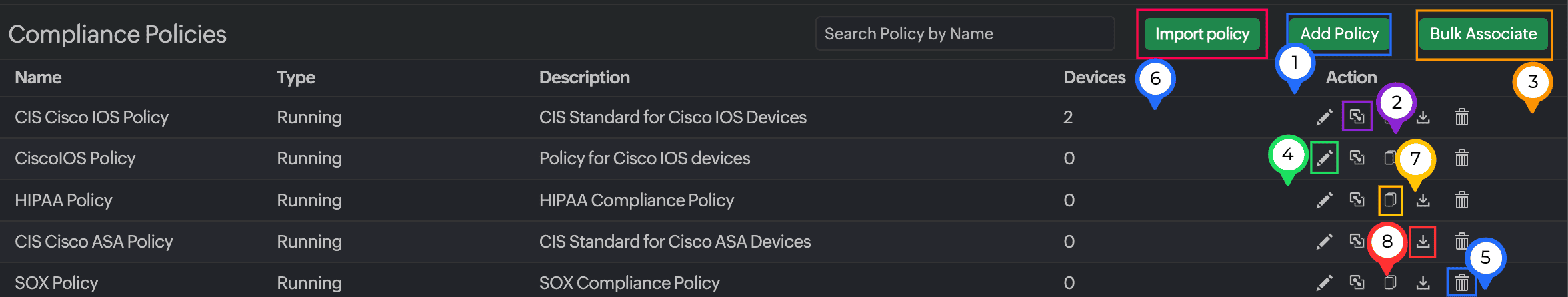 - Click Bulk Associate in the top-right section of the Compliance Policies page (Figure 13, marked as 3).