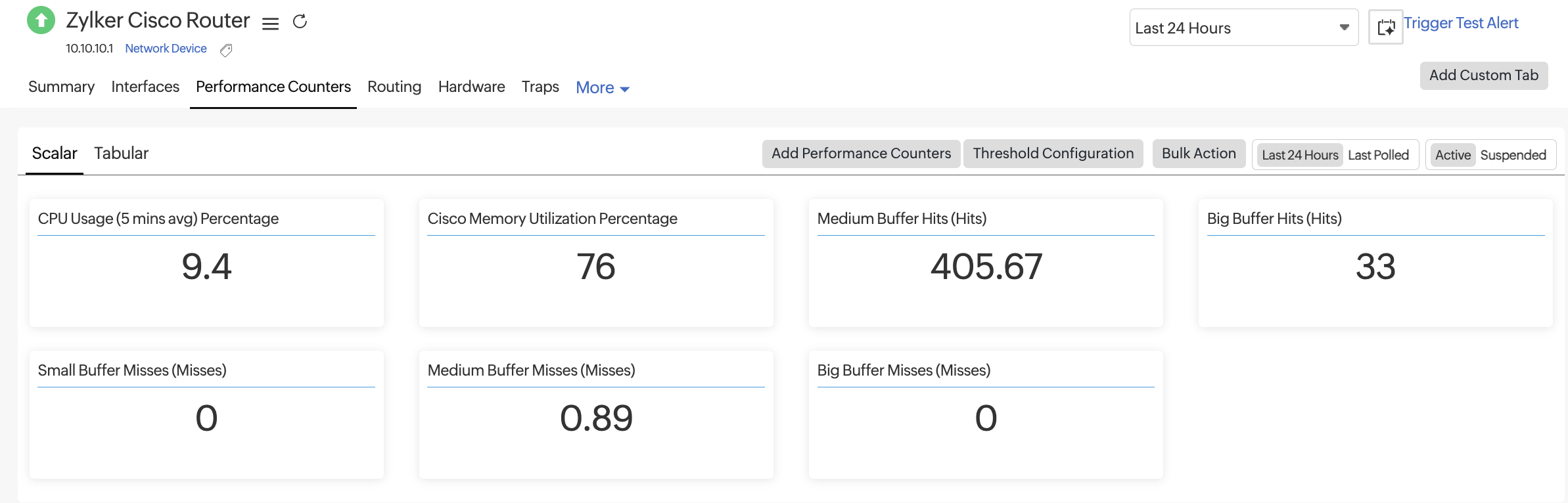 Track the availability and response times of routers configured in your network. Get deep visibility into key router performance indicators like buffer hit statistics and buffer miss statistics.