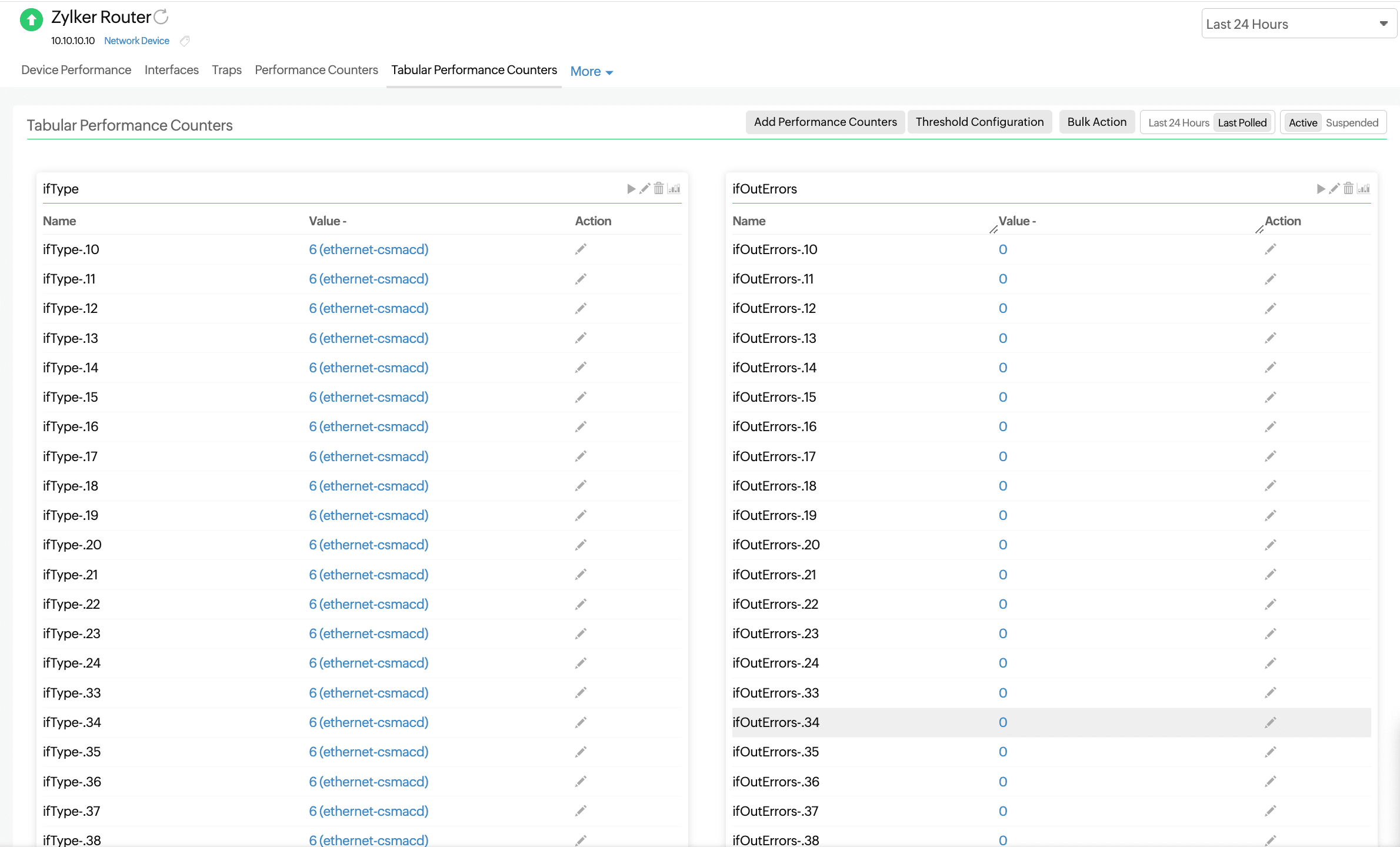 Monitor the tabular SNMP object identifiers of your network devices. With these, you can monitor multiple instances of the same attribute (such as for the memory, disk, or interfaces) of a single network device.