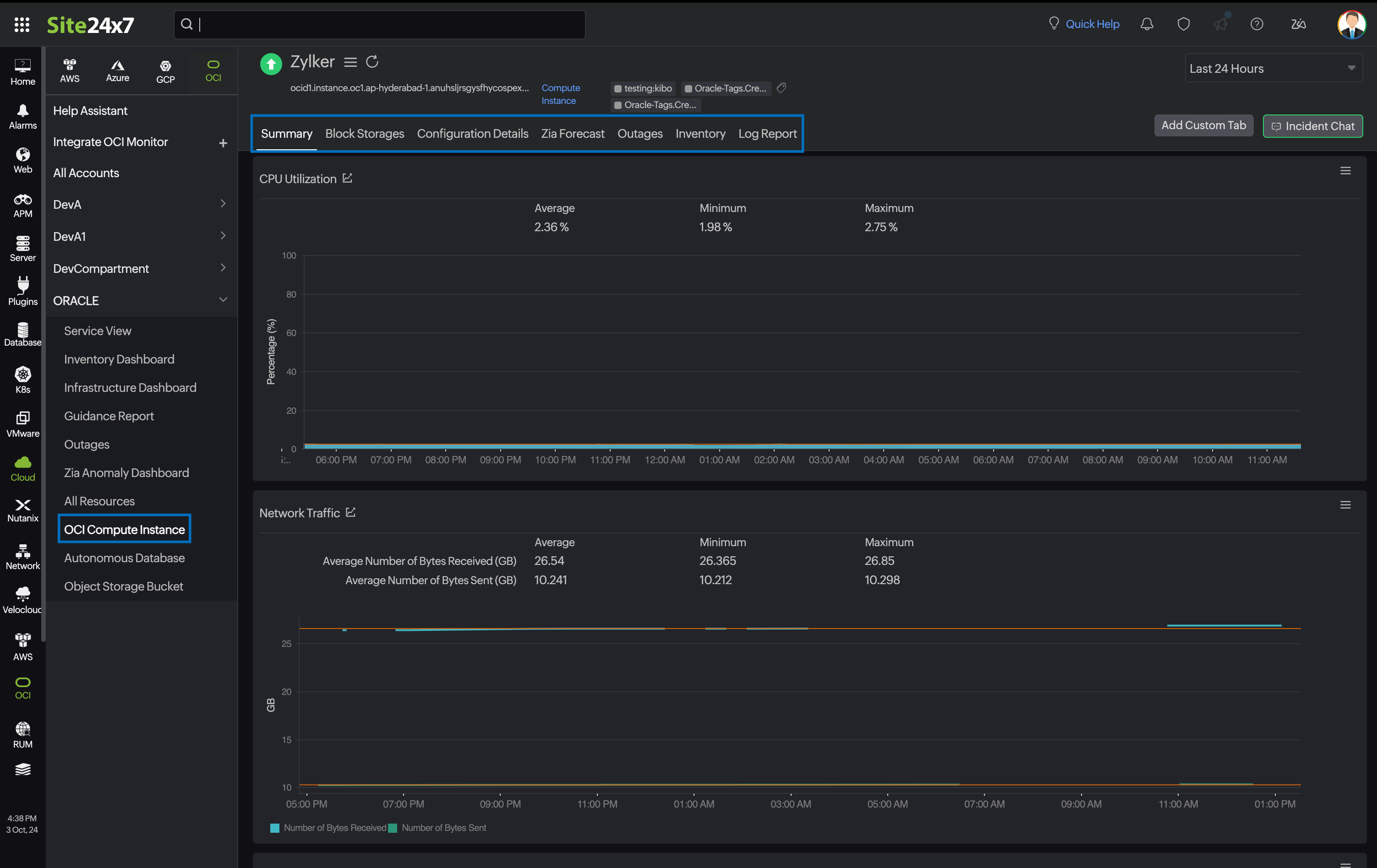 Site24x7’s integration with Compute Instance enables comprehensive monitoring of the VMand bare-metal server instances running in the OCI. With this integration, users can track key performance metrics, such as CPU Utilization, Memory Consumption, Network Traffic, and Disk I/O operations, providing real-time visibility into the health and performance of compute resources. This ensures that critical workloads are running efficiently and provides alerts when predefined thresholds are breached.