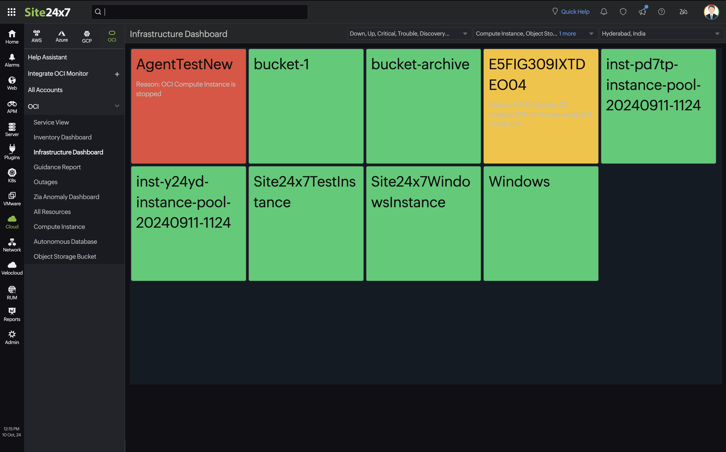 Site24x7's Infrastructure Dashboard for OCI monitoring provides an NOC-style view, providing a high-level summary of the health and performance of all monitored cloud resources within your OCI platform. The dashboard consolidates data of each OCI service that supports your application in the cloud and presents critical performance insights in one central location.