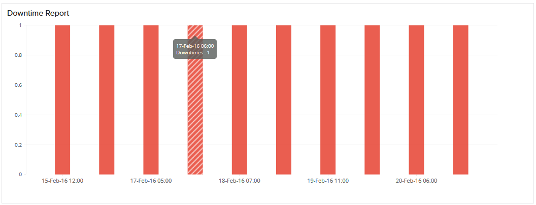 Downtime graph is mapped by counting the number of down times and plotting it against a selected time period. If the selected time period is within 24 hours, hour wise data will be plotted against X-axis. If the selected time range is outside 24 hours period, day wise data will be depicted against the X-axis.