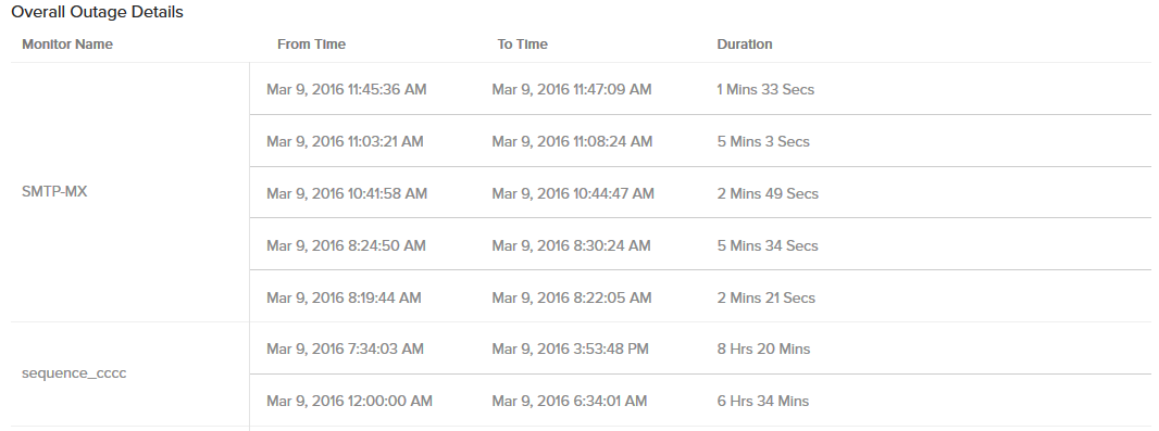 Monitors Outage Details provide a detailed interpretation of the outages incurred by all the monitors. The user gets to know the exact time frame and duration of outage.