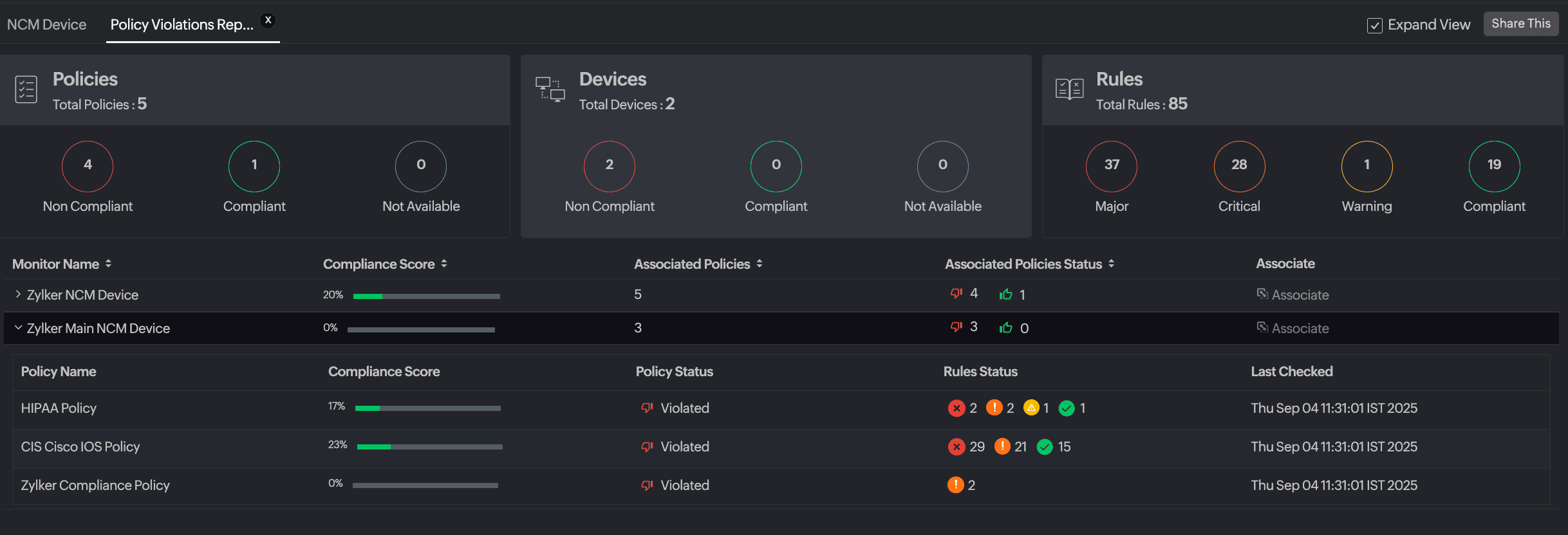 - Monitor Name, Compliance Score, Associated Policies, Associated Policy Status, and Associate. Click Associate to associate more policies to the device.