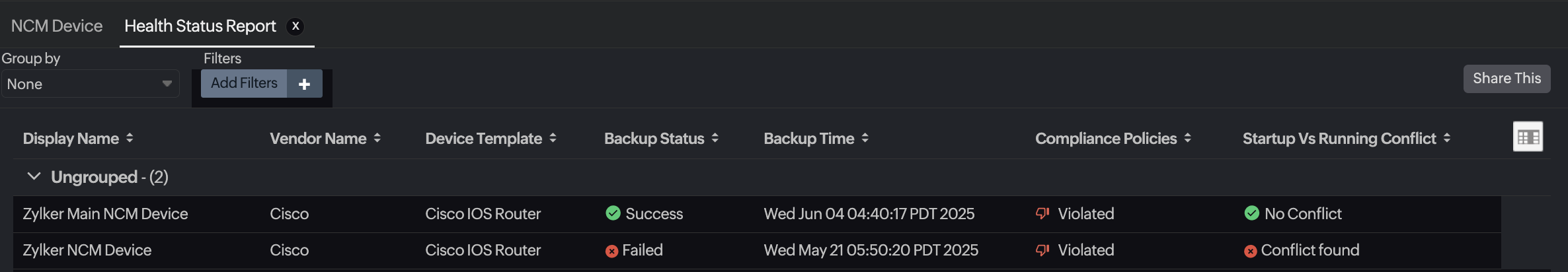The Health Status Report provides a centralized view of the backup and compliance health of your Network Configuration Manager monitors. This report helps you quickly identify backup failures, policy violations, and configuration mismatches.