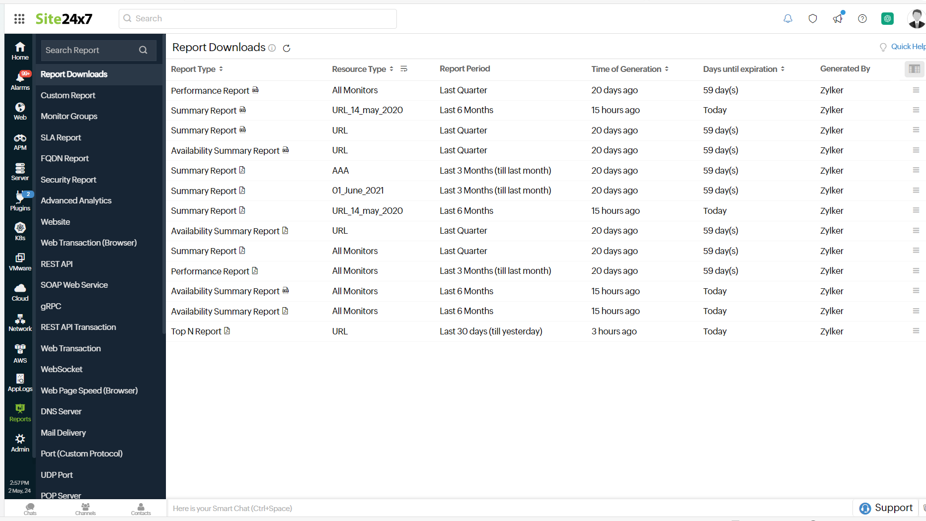 For example, imagine you need to view the Performance report of a Monitor group called Zylker. Instead of regenerating the report, you can access the one previously generated by the Admin from the Report Downloads section. To access the desired report in Site24x7, navigate to the Report Downloads section and locate the Performance report associated with the Zylker Monitor group. With a simple click, the report can be downloaded and instantly viewed, providing quick access to valuable performance insights without the need for generating the same report again.