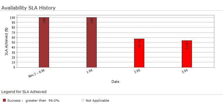 The Availability SLA History graph depicts the percentage of SLA achieved by the monitor, for a specified unit of time during the selected operating period. The average SLA achieved by the monitor can be deducted from this graphical data. Legends are provided below the graph to help decode the trends.