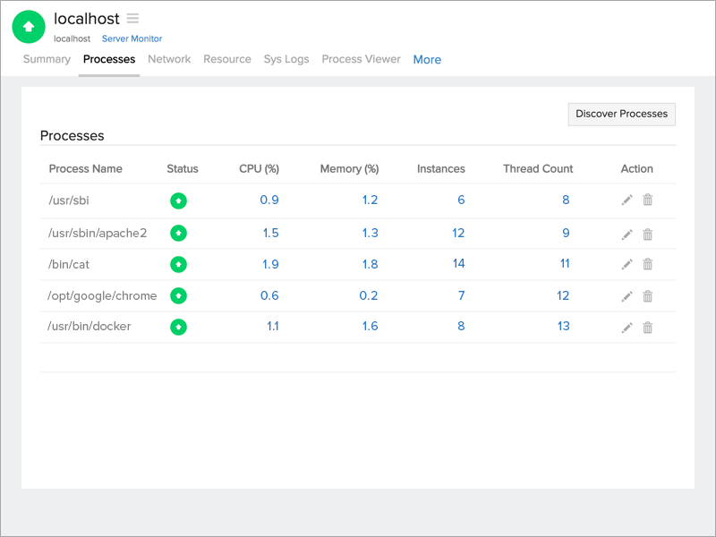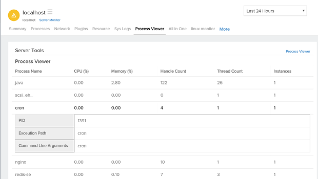 The various processes on the server monitor can be studied using the Process Viewer. Hovering the mouse on the process name lists their respective PID, Execution Path, and Command Line Arguments. Sort the processes based on CPU, memory handle, and thread count.