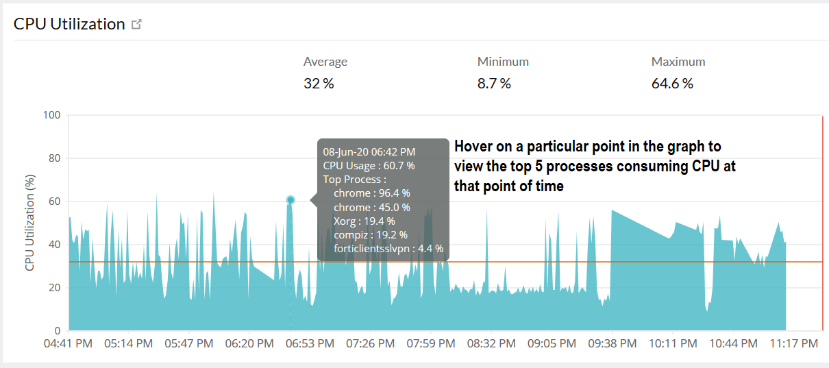 Also, view the top five processes consuming CPU for a particular point of time by hovering on a particular point in the CPU Utilization graph. The top process data is calculated using the Python module 'psutil'.